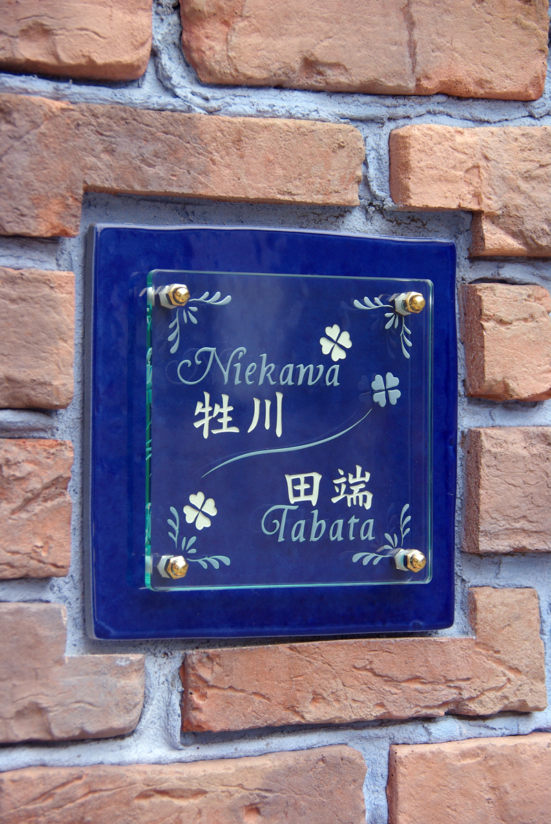 タイルのインディゴブルーの色が本当に素敵です。 そしてガラスの文字と、表札に掘り込まれた文字が素敵にマッチしています。 私の大好きなクローバーも、ガラスとタイルの二種類のバランスがとてもよくて、本当にすばらしい仕上がりに家族一同感動しました。 今から新居に取り付ける日が待ち遠しいです。 ありがとうございました。 返信