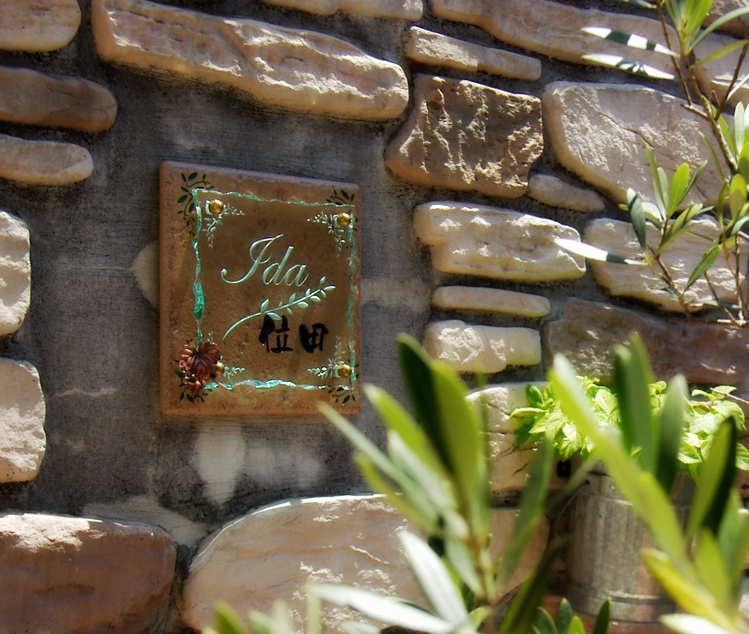 「これだ!」と、次の日 すぐに伺いました。とっても気さくな方で、早速 我が家まで来ていただいて、デザインしていただきました。美的感覚ゼロの私たち 漠然と話しただけなのに、出来上がった表札は、想像を遥かに超えた 素敵な素敵な表札でした。大満足です。ありがとうございました。