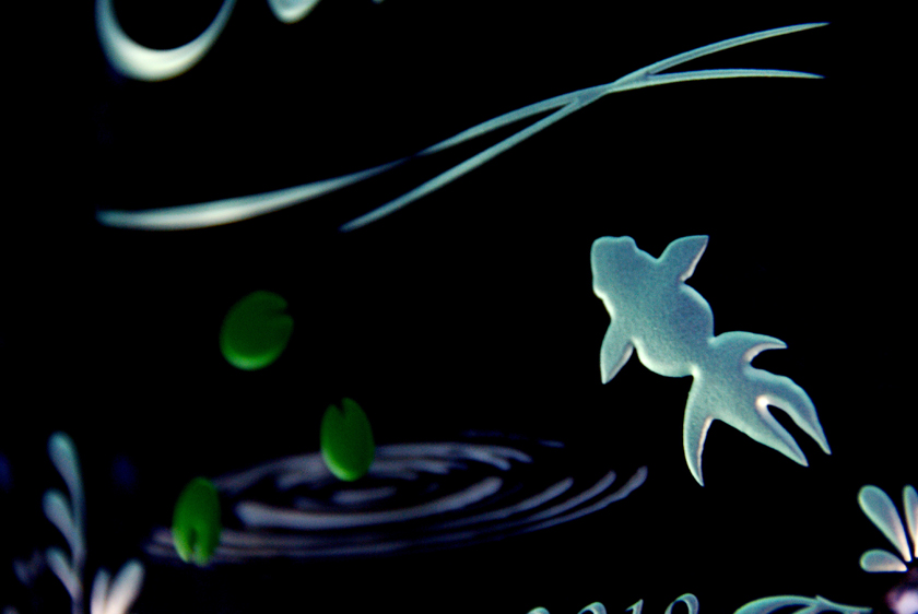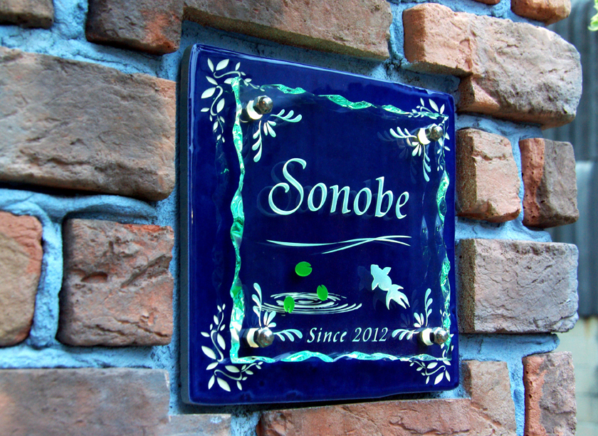Free-Style表札 LED仕様 アートガラス 金魚 2012/11/4 日曜日2012/11/4 日曜日 by miyasu ガラス表札【LED仕様】《AC電源》 アートガラスインディゴブルーフレーバータイル波紋金魚 ご希望の金魚のデザインをアートガラスに彫刻。 同じくガラスに裏彫りした浮き草は緑の着色、 その下に波紋をデザインしました。 千葉県に送ります。 お問い合せ用URL : お問い合せの際に上記URLをコピーして『お問い合せ内容』に貼り付けて頂ければ幸いです