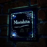 水玉模様のLED表札、暗くなるとタイルにも映り幻想的に門柱を飾ります。 インディゴブルーのフレーバータイルにも水玉を彫刻しました。 市内に送ります
