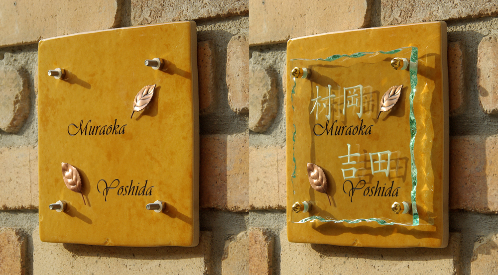 漢字はアートガラスに、ローマ字はタイルに彫刻