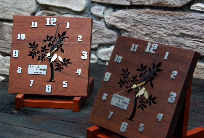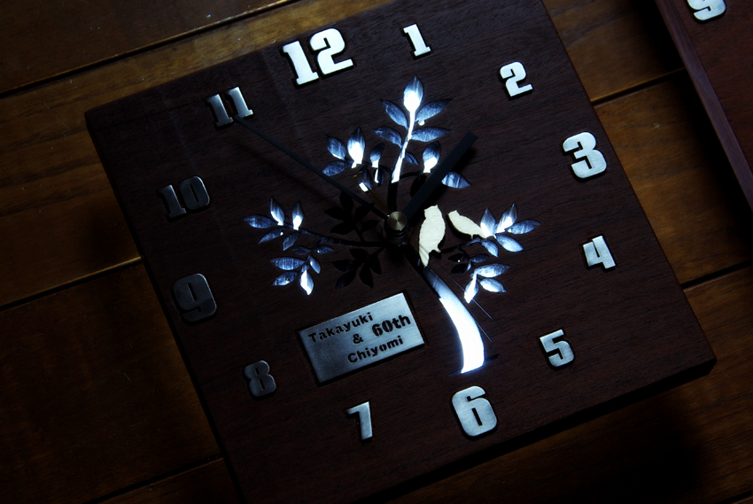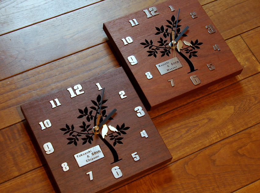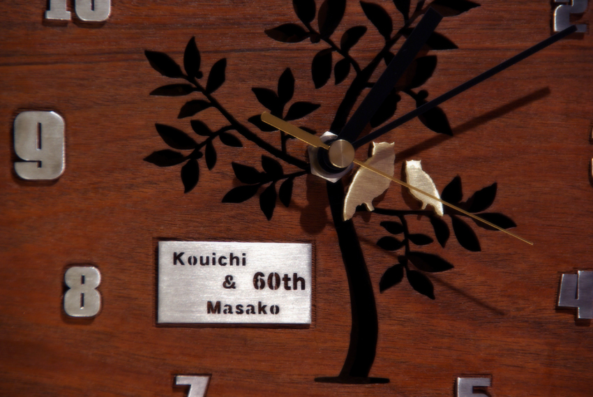 創作時計 還暦のお祝い 2013/12/19 木曜日 by miyasu 創作 イペ(南洋材)創作時計 還暦のお祝いに贈る壁掛け時計(置き)を製作しました 素材はイペ(南洋材)、真鍮のつがいのフクロウをアクセントに・・・ ふくろうは、語呂合わせもでき、開運招福で縁起が良いとされている 福・・・福をもたらす。 福籠・・・福が籠(こ)もる。 不苦労・・・苦労知らず。 福老・・・老いて福。不老長寿。 梟・・・首が良く回るので商売繁盛。 等々 市内に送ります。 お問い合せ用URL : お問い合せの際に上記URLをコピーして『お問い合せ内容』に貼り付けて頂ければ幸いです