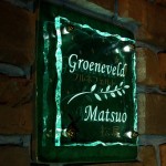 ベースタイルに家紋『丸に左三階松』を彫刻 着色はシャンパンゴールド 暗くなるLEDが自動点灯して彫刻した文字が浮き上がります。 側面を5面体にカット、研磨したオリジナルガラスを使用 宮城県に送 […]