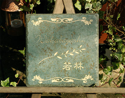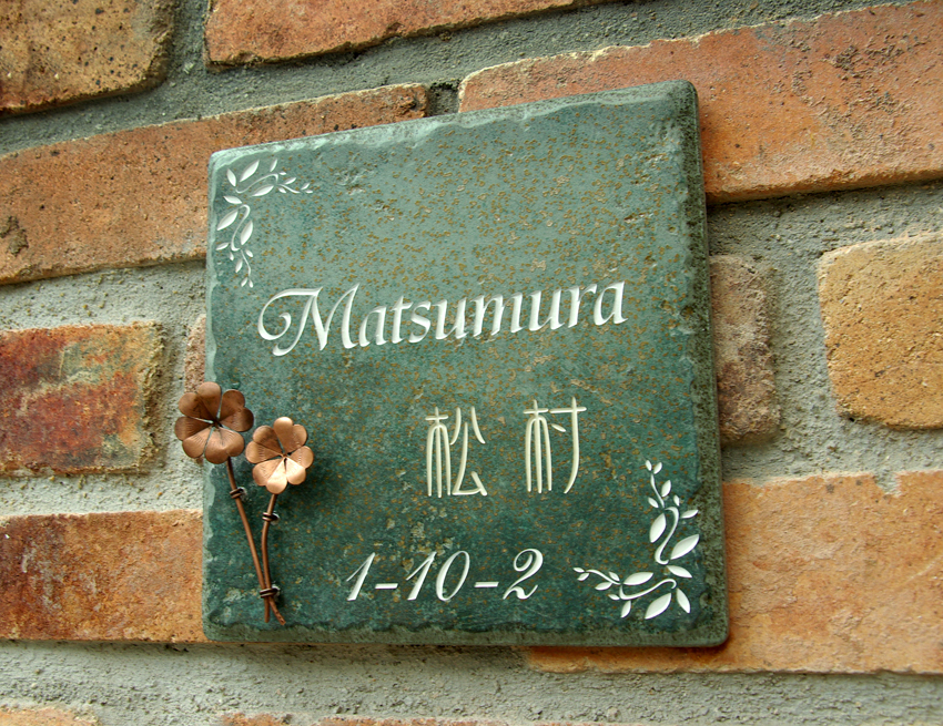 味わいのある緑青タイルに深く文字を彫刻しています。