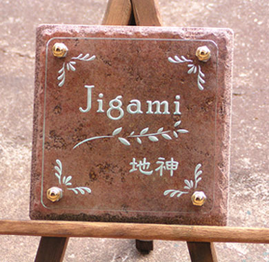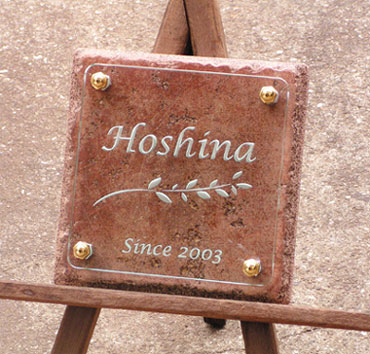 和をイメージしたタイルに白の着色の文字を彫刻