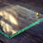 小さなサイズのクリスタルガラス表札です。15X15cmの緑青タイルにガラスを重ねました。 手作りの銅製クローバーを2つ付けました。 京都に送ります。