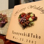 テラコッタをハート型にくり貫いて手作りの金網を嵌め込みました。 小さな多肉植物の寄植えをして、披露宴の受付を飾ります。