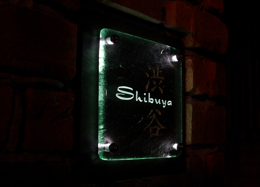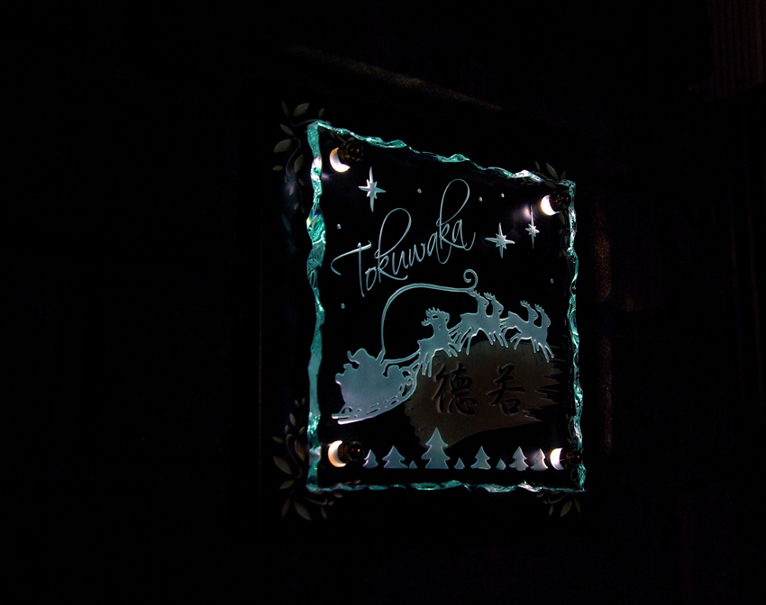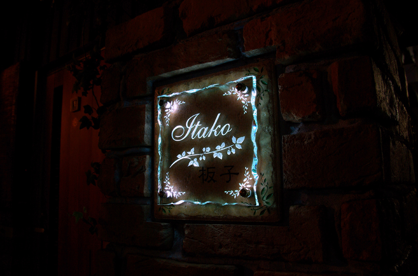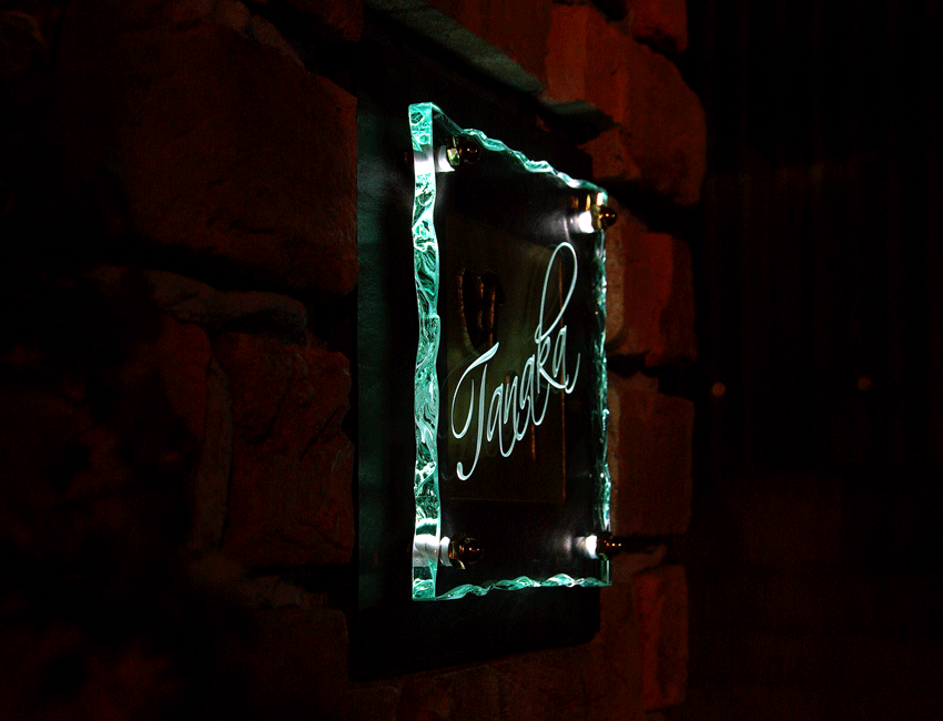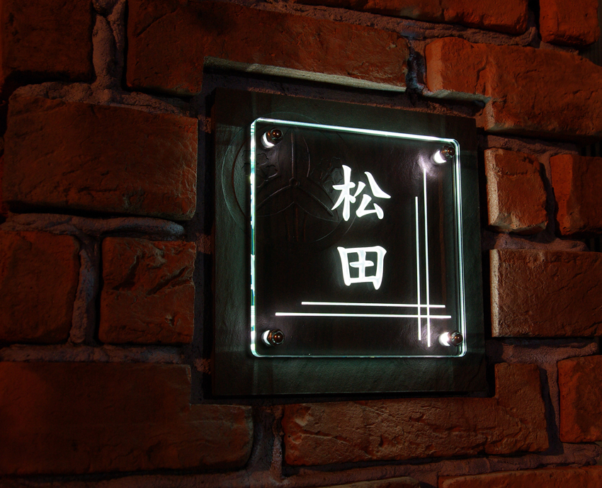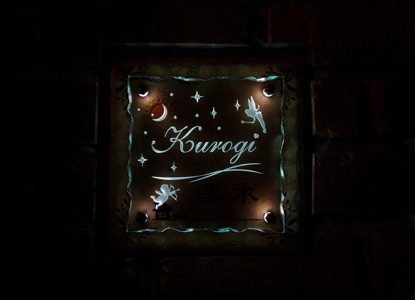 夜はLEDが点灯してガラスの文字が浮き上がります