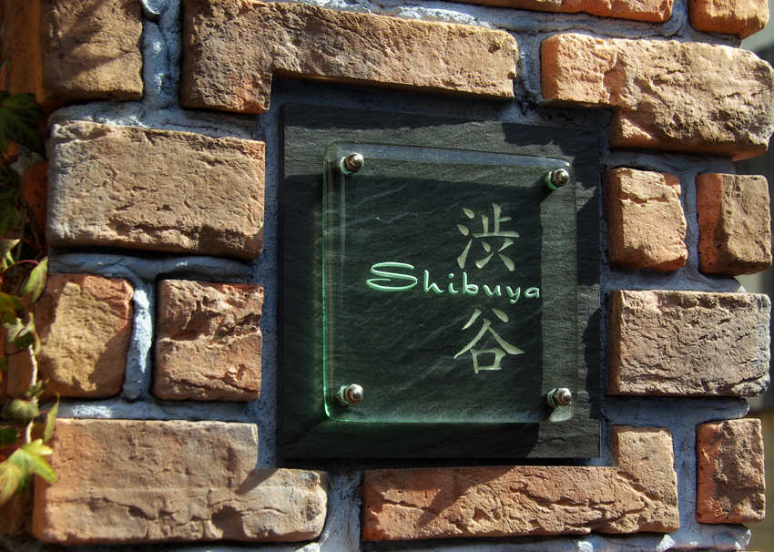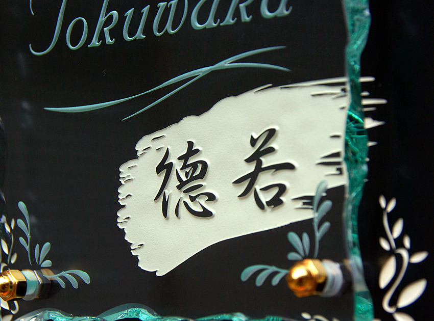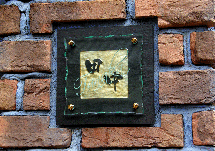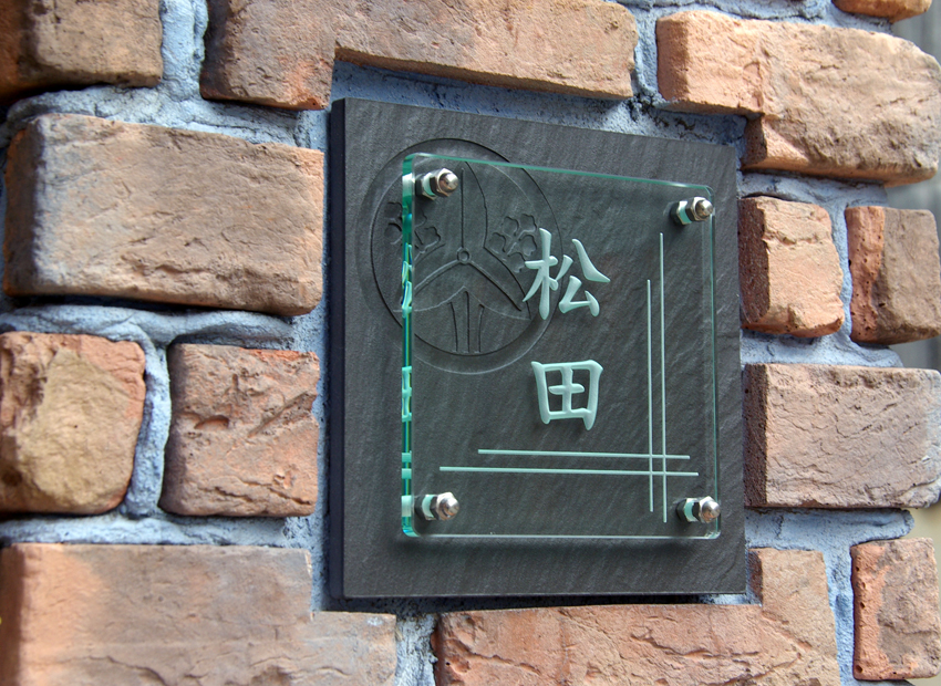 和調ブラックタイルに家紋(丸に立ち沢瀉)を彫刻しました。