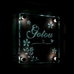 表情のあるブラックのタイルにシンプルなデザインで製作しました。 暗くなるとLEDが自動点灯して文字を浮き上がらせます。 市内に送ります。