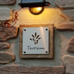 フレーバータイル(アプリコット色)にステンレスを重ねました。 ナット固定の脱着可能な銅のリーフを作りました。(Free-Style表札用) 機能門柱にはステンレスで番地プレートを製作 ご近所に取り付けに行ってきました。