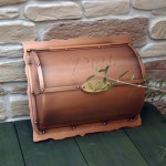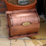 宝の地図と宝箱をイメージして製作した銅製ポスト・・・ 意匠登録第1182713号の第4年目の登録更新をしました。 ご注文を頂いてから一台一台組み上げます。