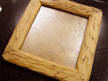 彫刻したアンティークタイルにウッドフレーム(イペ材)を作って飾ります。