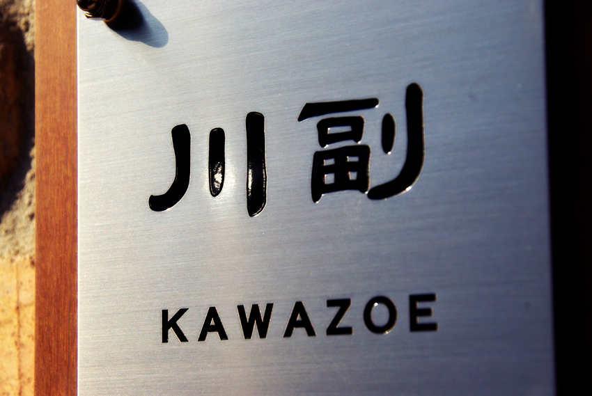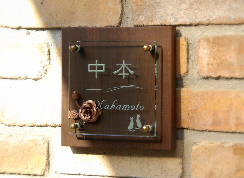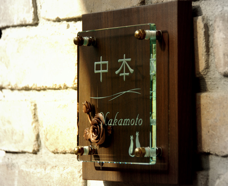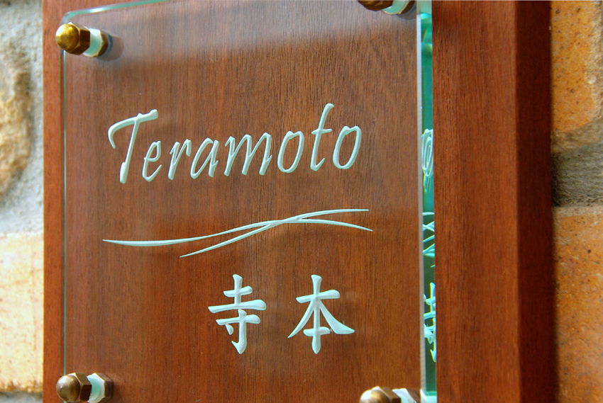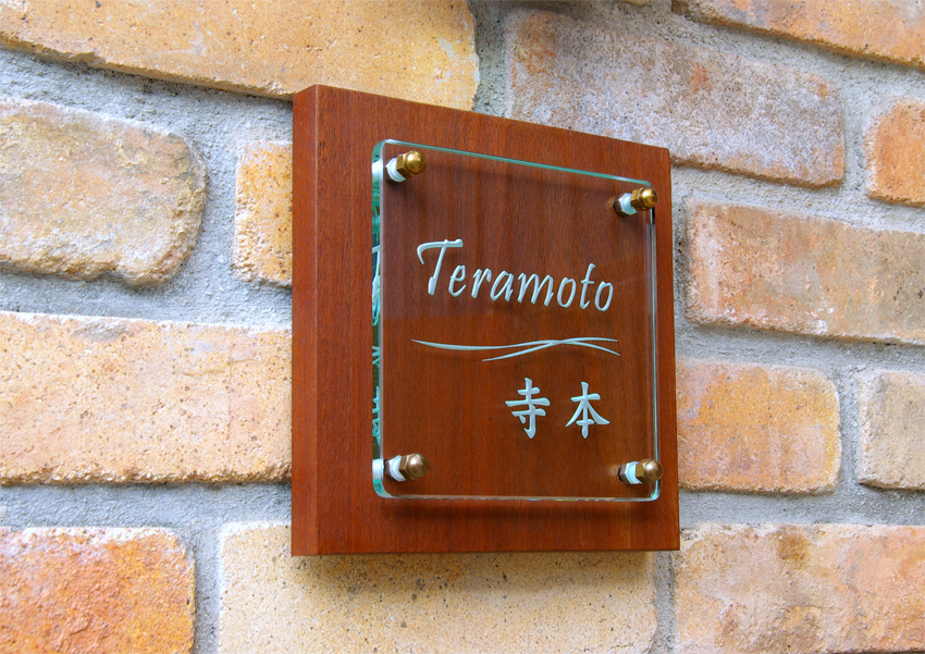機能門柱の無機質な表札をウッド(イペ)をベースに