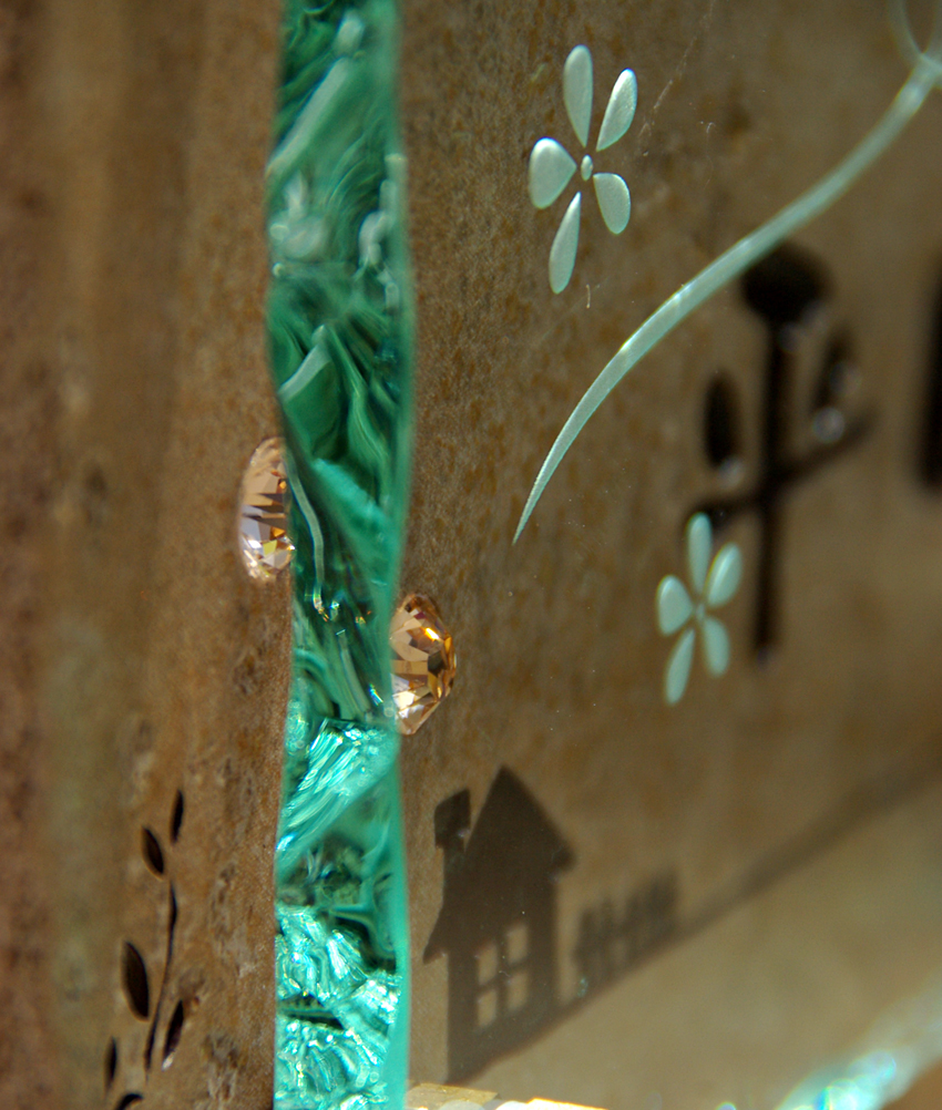 ]]>タイル(350X100)にスワロフスキーを埋め込み、彫刻したガラスを重ねました。