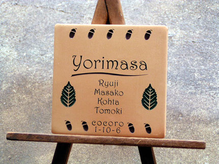 テラコッタ表札 2002/12/4 水曜日2019/10/8 火曜日 by miyasu テラコッタ表札 お客様のイメージFAXを・・・ デザインして加工しました・・・ 世界で一つの表札です(^^♪ yorimasa お問い合せ用URL : このページで紹介した作品についてのお問い合わせは、上記URLをコピーして 『お問い合せ』のぺージの記入欄に上記「お問い合せ用URL」を貼り付けてご連絡ください。 ご質問、見積依頼、ご注文についても『お問い合せ』のページからヒロノクラフト公式LINE及びメールでお願いします。 ※ご利用いただく端末によっては、コメント送信後にエラー表示されるなどのうまく反映されない場合がございます。 その場合はLINEにて、ご連絡ください。