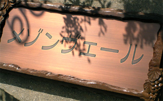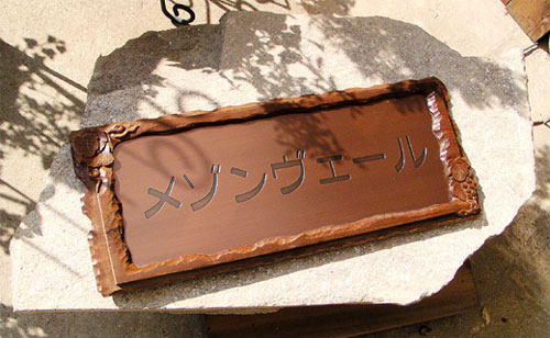 看板製作 2003/6/1 日曜日2012/8/23 木曜日 by miyasu オーダーサイン いぶし銅板にイペ材のフレーム 葡萄のレリーフを彫刻しました。 ウレタンのつや消しクリアーで表面を仕上げました。 お問い合せ用URL : このページで紹介した作品についてのお問い合わせは、上記URLをコピーして 『お問い合せ』のぺージの記入欄に上記「お問い合せ用URL」を貼り付けてご連絡ください。 ご質問、見積依頼、ご注文についても『お問い合せ』のページからヒロノクラフト公式LINE及びメールでお願いします。 ※ご利用いただく端末によっては、コメント送信後にエラー表示されるなどのうまく反映されない場合がございます。 その場合はLINEにて、ご連絡ください。