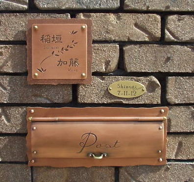 銅表札 2004/7/18 日曜日2012/8/28 火曜日 by miyasu 銅・真鍮の表札 いぶし銅の濃淡で表現した純銅の表札です。 埋め込み型のポストはもう少しお待ちくださいm(__)m 埋め込み型ポストが仕上がりました。 *このポストは不定期で製作しているため納期の確認をお願いします。 まだ門灯がついておりませんが、表札とポストを取り付けていただきました。 すでにご近所でも評判になっております。 お問い合せ用URL : このページで紹介した作品についてのお問い合わせは、上記URLをコピーして 『お問い合せ』のぺージの記入欄に上記「お問い合せ用URL」を貼り付けてご連絡ください。 ご質問、見積依頼、ご注文についても『お問い合せ』のページからヒロノクラフト公式LINE及びメールでお願いします。 ※ご利用いただく端末によっては、コメント送信後にエラー表示されるなどのうまく反映されない場合がございます。 その場合はLINEにて、ご連絡ください。