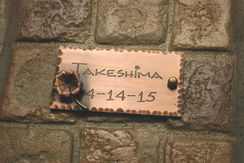 クリスタルガラス表札 2004/8/30 月曜日2012/9/21 金曜日 by miyasu クリスタルガラス表札 “Welcome to our home”こだわりの表札がお客様を迎えます。 銅製のクローバー付き番地プレートはもう少しお待ちください。 銅製番地プレートの型切りが出来ました。この小さな銅板を加工してイメージのように仕上げていきます。 楽しみに待っていてくださいね(*^^)v インターホンの下につける小さな銅のプレート・・・これから研磨していぶし仕上げを施し仕上がります。 表札とインターホンが離れているためにご提案しました。イメージ通り仕上がりました。 お問い合せ用URL : このページで紹介した作品についてのお問い合わせは、上記URLをコピーして 『お問い合せ』のぺージの記入欄に上記「お問い合せ用URL」を貼り付けてご連絡ください。 ご質問、見積依頼、ご注文についても『お問い合せ』のページからヒロノクラフト公式LINE及びメールでお願いします。 ※ご利用いただく端末によっては、コメント送信後にエラー表示されるなどのうまく反映されない場合がございます。 その場合はLINEにて、ご連絡ください。