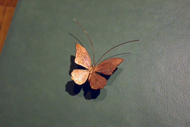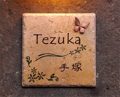 アンティークタイル表札 銅の蝶 2005/1/27 木曜日2012/8/25 土曜日 by miyasu アンティークタイル表札【薄茶色】 銅でご希望の蝶を一頭製作しました。 これからいぶしてアンティークタイルのワンポイントに取り付けます。 イブシ仕上げの濃淡で模様を浮き上がらせました。 銅の蝶に合わせて手書きのデザインでレイアウトしました。 3点でしっかり固定しています。 お問い合せ用URL : このページで紹介した作品についてのお問い合わせは、上記URLをコピーして 『お問い合せ』のぺージの記入欄に上記「お問い合せ用URL」を貼り付けてご連絡ください。 ご質問、見積依頼、ご注文についても『お問い合せ』のページからヒロノクラフト公式LINE及びメールでお願いします。 ※ご利用いただく端末によっては、コメント送信後にエラー表示されるなどのうまく反映されない場合がございます。 その場合はLINEにて、ご連絡ください。