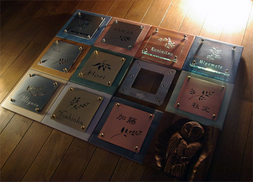 Free-Style表札 2005/3/21 月曜日2012/10/2 火曜日 by miyasu フリースタイル表札 10色のカラータイルと4種類のプレート素材、デザインはオリーブの葉をイメージしたもの数種類を用意しました。 写真はステンレスのリーフカット お問い合せ用URL : このページで紹介した作品についてのお問い合わせは、上記URLをコピーして 『お問い合せ』のぺージの記入欄に上記「お問い合せ用URL」を貼り付けてご連絡ください。 ご質問、見積依頼、ご注文についても『お問い合せ』のページからヒロノクラフト公式LINE及びメールでお願いします。 ※ご利用いただく端末によっては、コメント送信後にエラー表示されるなどのうまく反映されない場合がございます。 その場合はLINEにて、ご連絡ください。