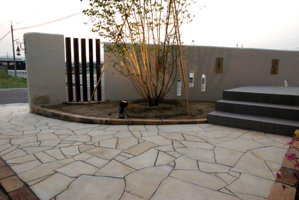 角地面を利用して長い塀を作り、イペの角柱で門柱とアールで繋ぎました。