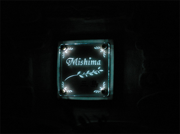 クリスタルガラス表札 LED仕様 2006/8/31 木曜日2012/8/21 火曜日 by miyasu ガラス表札【LED仕様】《AC電源》 アイボリーのフレーバータイルと合わせました。 ガラスの彫刻をボルトに埋め込んだLED(発光ダイオード)で照らします。 昼と夜で表情が変わります。 お問い合せ用URL : このページで紹介した作品についてのお問い合わせは、上記URLをコピーして 『お問い合せ』のぺージの記入欄に上記「お問い合せ用URL」を貼り付けてご連絡ください。 ご質問、見積依頼、ご注文についても『お問い合せ』のページからヒロノクラフト公式LINE及びメールでお願いします。 ※ご利用いただく端末によっては、コメント送信後にエラー表示されるなどのうまく反映されない場合がございます。 その場合はLINEにて、ご連絡ください。