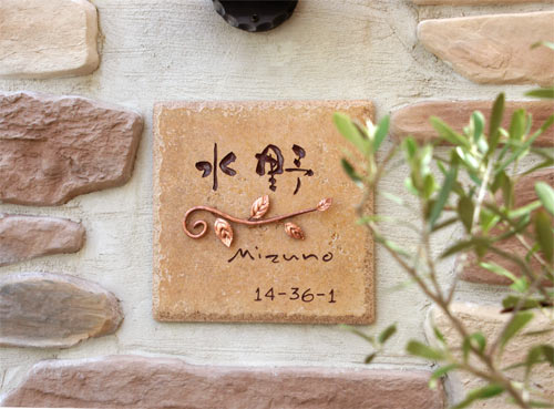 アンティークタイル表札 2006/9/15 金曜日2012/8/25 土曜日 by miyasu アンティークタイル表札【薄茶色】 彫金で仕上げた銅の小枝をアクセントにオリジナルの和書体でレイアウトしました。 お問い合せ用URL : このページで紹介した作品についてのお問い合わせは、上記URLをコピーして 『お問い合せ』のぺージの記入欄に上記「お問い合せ用URL」を貼り付けてご連絡ください。 ご質問、見積依頼、ご注文についても『お問い合せ』のページからヒロノクラフト公式LINE及びメールでお願いします。 ※ご利用いただく端末によっては、コメント送信後にエラー表示されるなどのうまく反映されない場合がございます。 その場合はLINEにて、ご連絡ください。