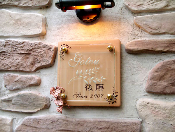 クリスタルガラス表札 2007/1/27 土曜日2012/9/11 火曜日 by miyasu クリスタルガラス表札 手作りの銅製のアイビーを取り付けて立体的に仕上げました。 タイル彫刻とガラスの彫刻で奥行きのある表札に仕上がります。 お問い合せ用URL : このページで紹介した作品についてのお問い合わせは、上記URLをコピーして 『お問い合せ』のぺージの記入欄に上記「お問い合せ用URL」を貼り付けてご連絡ください。 ご質問、見積依頼、ご注文についても『お問い合せ』のページからヒロノクラフト公式LINE及びメールでお願いします。 ※ご利用いただく端末によっては、コメント送信後にエラー表示されるなどのうまく反映されない場合がございます。 その場合はLINEにて、ご連絡ください。
