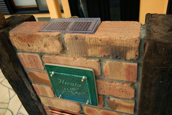 NEW FREE-STYLE表札 LED仕様(ソーラータイプ) 2007/4/20 金曜日2012/8/21 火曜日 by miyasu ガラス表札【LED仕様】《ソーラー電源》 門柱の上にヒロノクラフトオリジナルソーラーユニットを埋め込むスペースを作ります。 表札ユニット部のコードを通す穴をあけて・・・ 防水コネクタで表札と繋ぎます。 暗くなると自動点灯しガラスに彫刻した文字を浮き上がらせます。 キャパシタ(電気二重層コンデンサ)を使ったソーラーユニットは天候が悪くてもLEDは点灯します。 お問い合せ用URL : このページで紹介した作品についてのお問い合わせは、上記URLをコピーして 『お問い合せ』のぺージの記入欄に上記「お問い合せ用URL」を貼り付けてご連絡ください。 ご質問、見積依頼、ご注文についても『お問い合せ』のページからヒロノクラフト公式LINE及びメールでお願いします。 ※ご利用いただく端末によっては、コメント送信後にエラー表示されるなどのうまく反映されない場合がございます。 その場合はLINEにて、ご連絡ください。