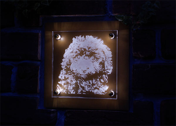 FREE-STYLE表札 LED仕様 ピクチャー 2007/8/27 月曜日2012/8/21 火曜日 by miyasu ガラス表札【LED仕様】《ソーラー電源》 我が家の愛犬”nonno”(トイプードル4ヶ月)をモデルに・・・ 写真から写して 忠実に彫刻で表現しました 夜になるとLEDの光で浮き上がります。 番犬にはならない!?^_^; お問い合せ用URL : このページで紹介した作品についてのお問い合わせは、上記URLをコピーして 『お問い合せ』のぺージの記入欄に上記「お問い合せ用URL」を貼り付けてご連絡ください。 ご質問、見積依頼、ご注文についても『お問い合せ』のページからヒロノクラフト公式LINE及びメールでお願いします。 ※ご利用いただく端末によっては、コメント送信後にエラー表示されるなどのうまく反映されない場合がございます。 その場合はLINEにて、ご連絡ください。