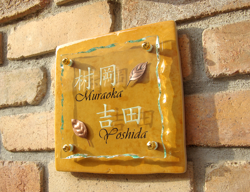 漢字はアートガラスに、ローマ字はタイルに彫刻