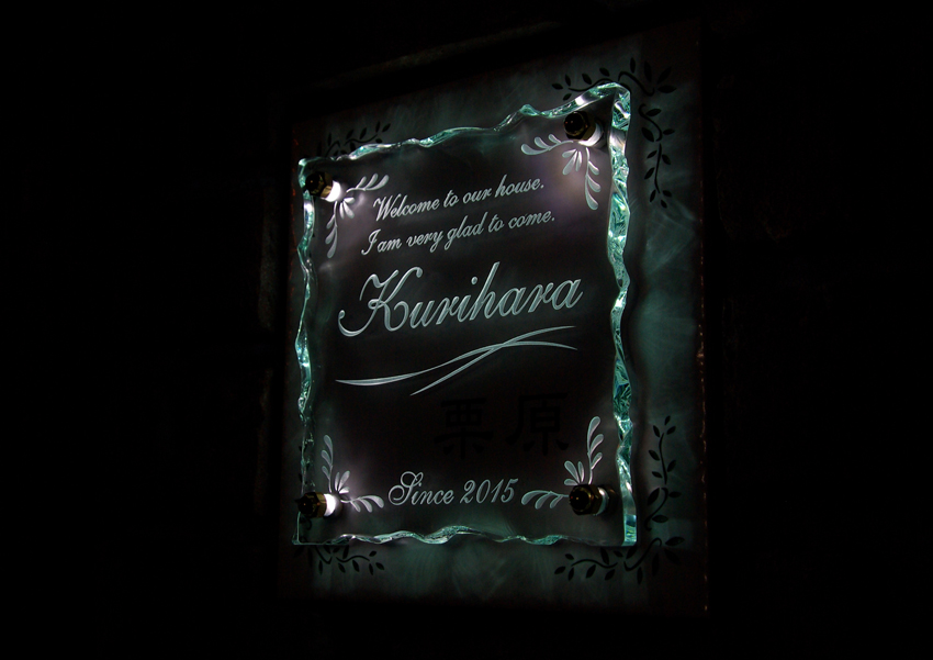 Free-Style表札 LED仕様 アートガラス 2015/10/17 土曜日2019/10/30 水曜日 by miyasu 施工写真 ガラス表札【LED仕様】《AC電源》 ホワイトアートガラス施工写真 @LINEでスムーズなやり取りをさせていただきました。 こだわりのLED仕様のアートガラスの表札 暗くなると自動点灯でガラスの彫刻が浮き上がります。 茨城県に送ります。 施工写真 kurihara 栗原 お問い合せ用URL : このページで紹介した作品についてのお問い合わせは、上記URLをコピーして 『お問い合せ』のぺージの記入欄に上記「お問い合せ用URL」を貼り付けてご連絡ください。 ご質問、見積依頼、ご注文についても『お問い合せ』のページからヒロノクラフト公式LINE及びメールでお願いします。 ※ご利用いただく端末によっては、コメント送信後にエラー表示されるなどのうまく反映されない場合がございます。 その場合はLINEにて、ご連絡ください。