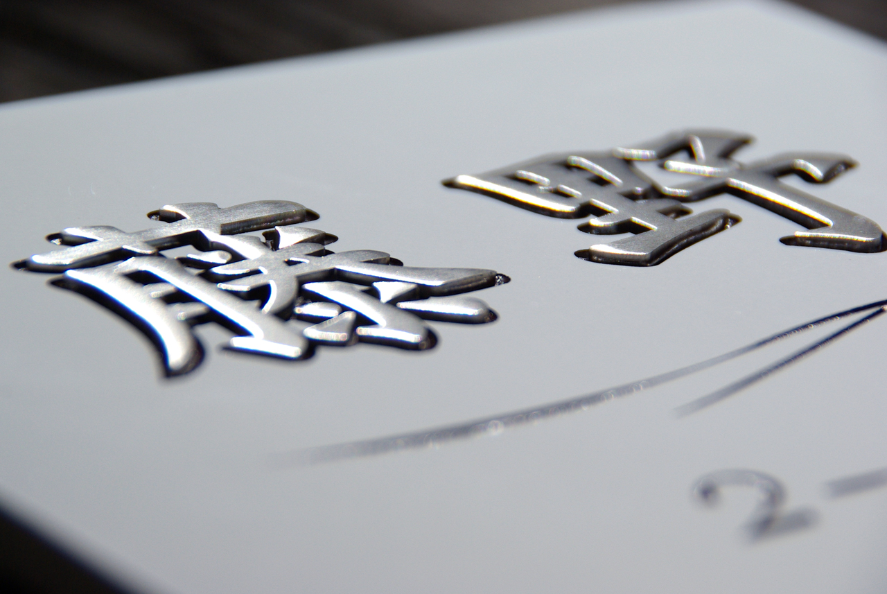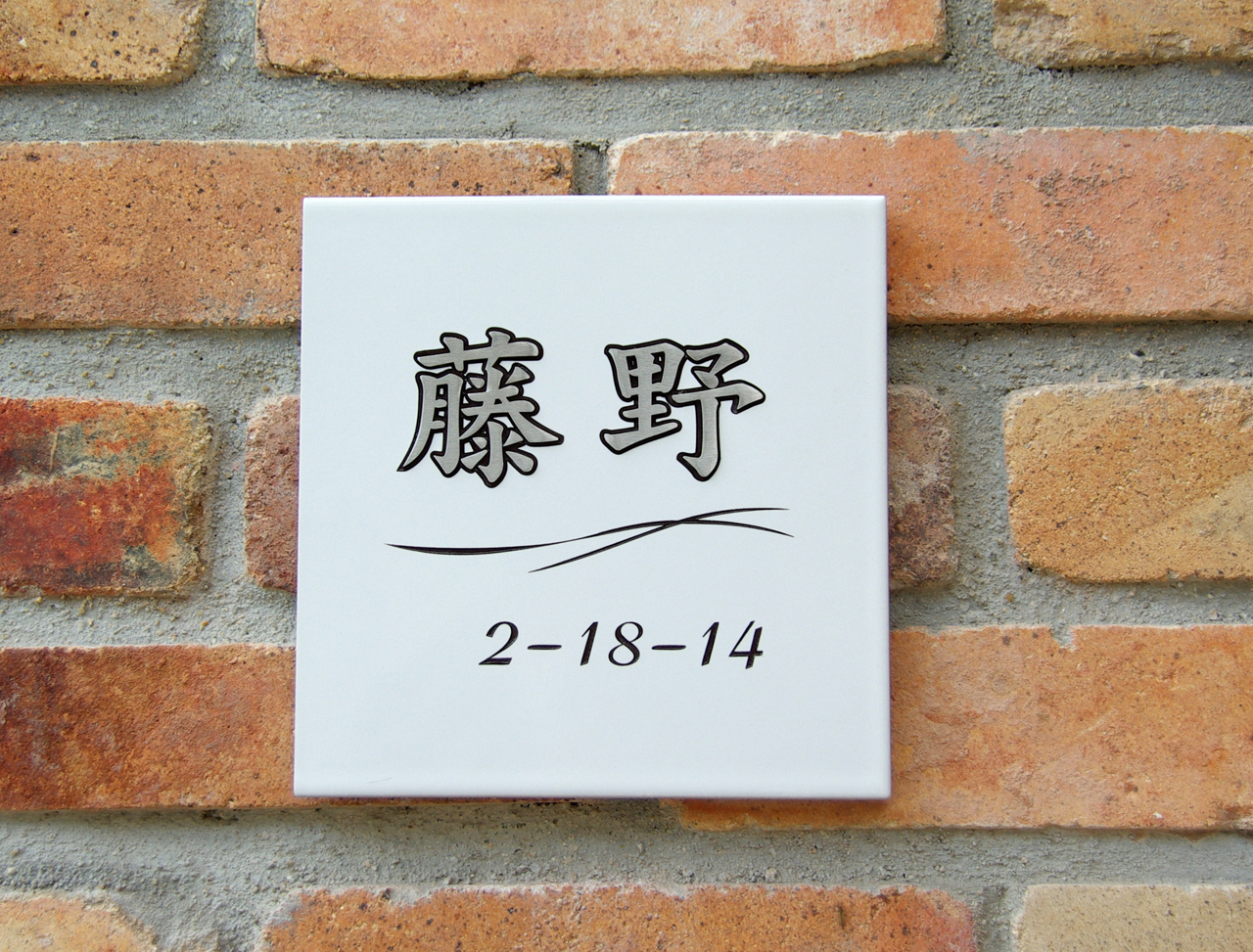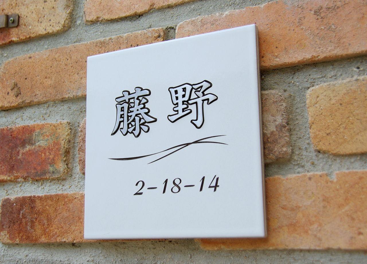 風水に良いと言われるホワイトタイルに浮き文字の表札(ステンレス象嵌)