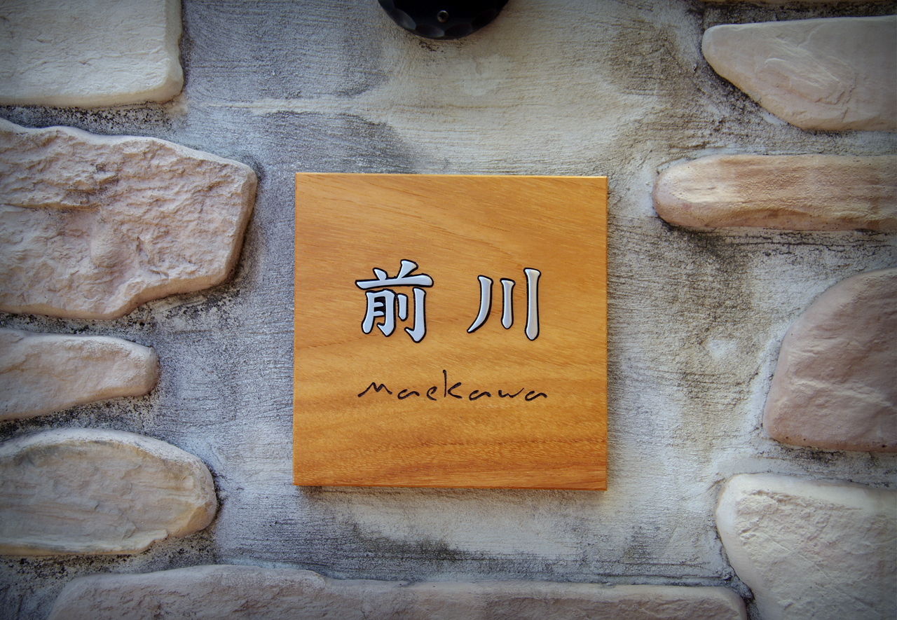 アパ材にステンレスの浮き文字の表札(象嵌加工) 17x17cm