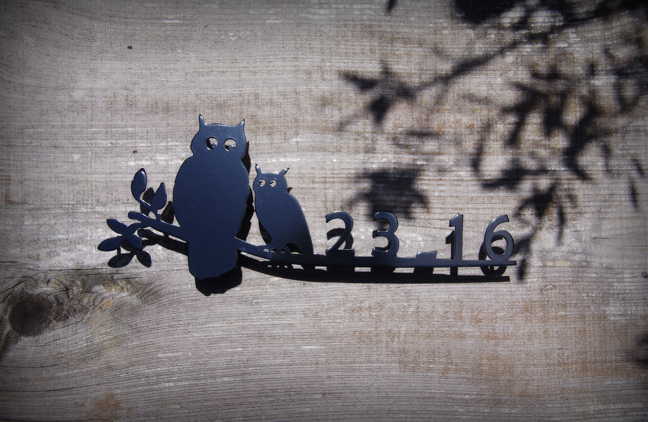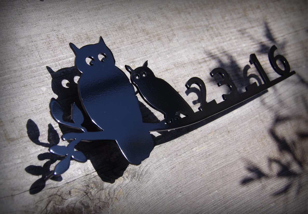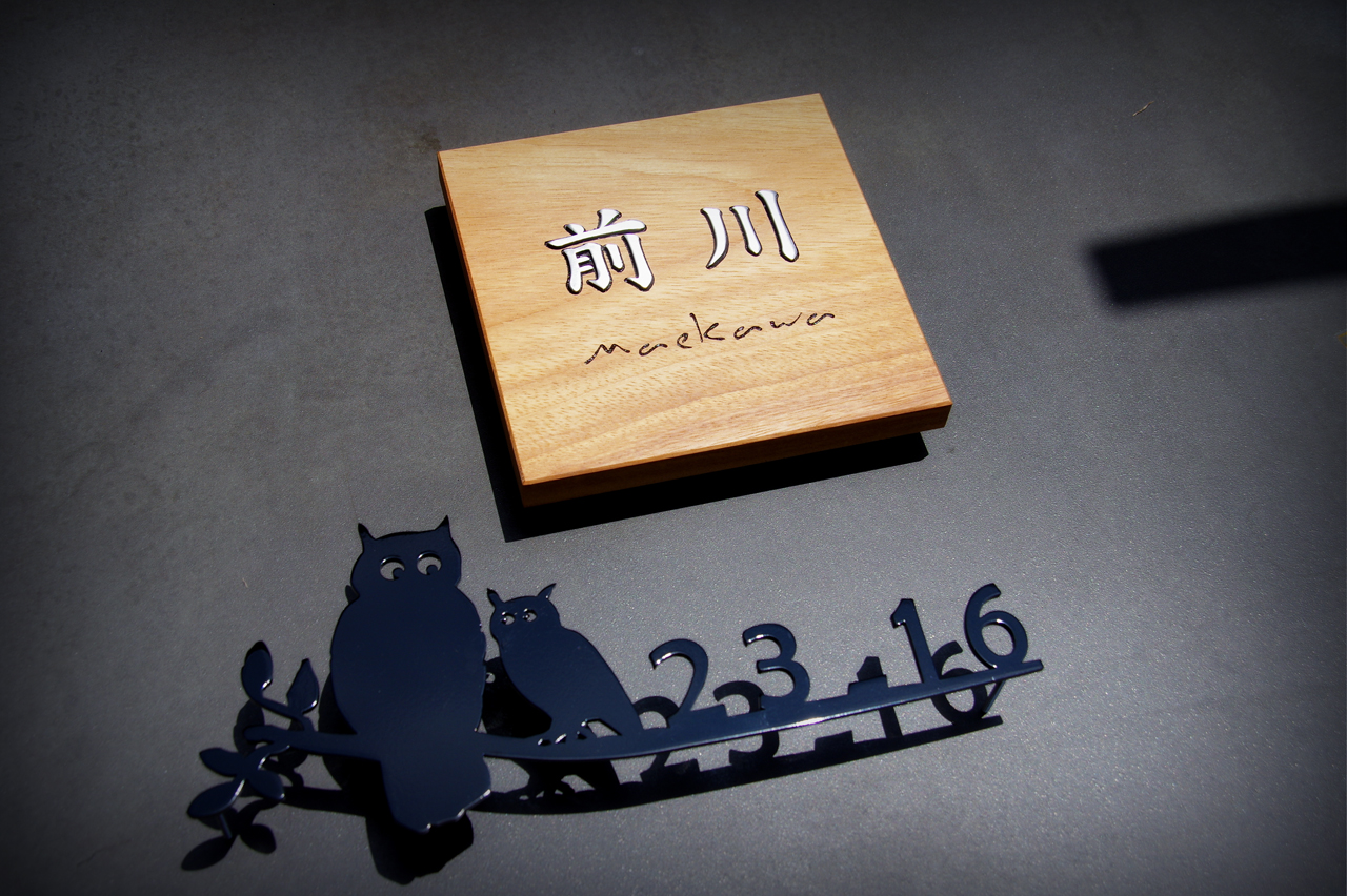 番地はフクロウをモチーフにお任せでステンレス(ブラック焼付け塗装)でデザイン、製作