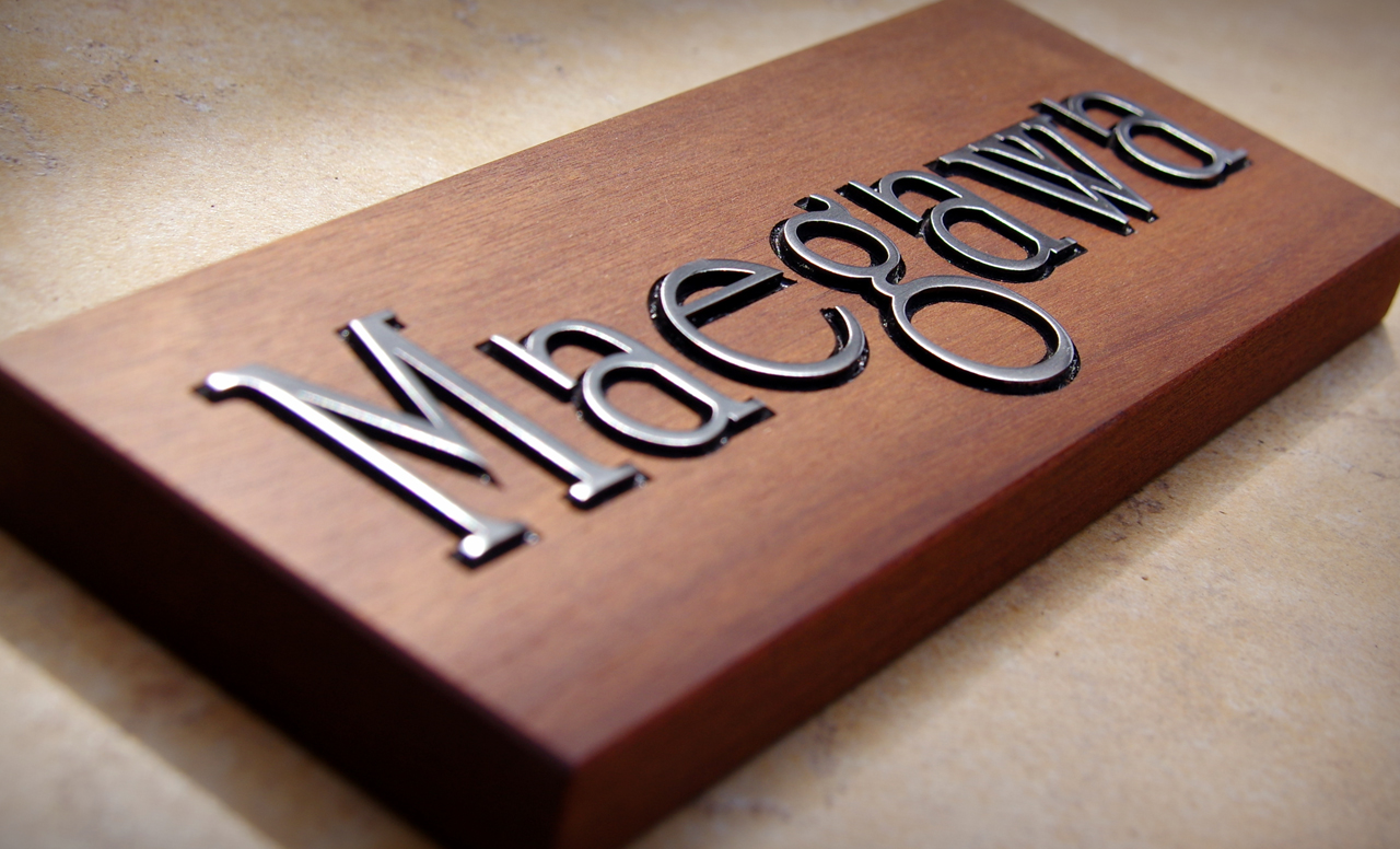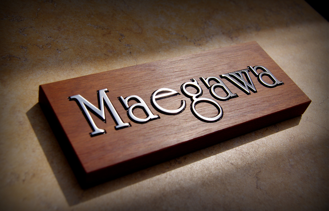 研磨仕上げのステンレスの切り文字を嵌め込んで浮かせて固定(象嵌加工)