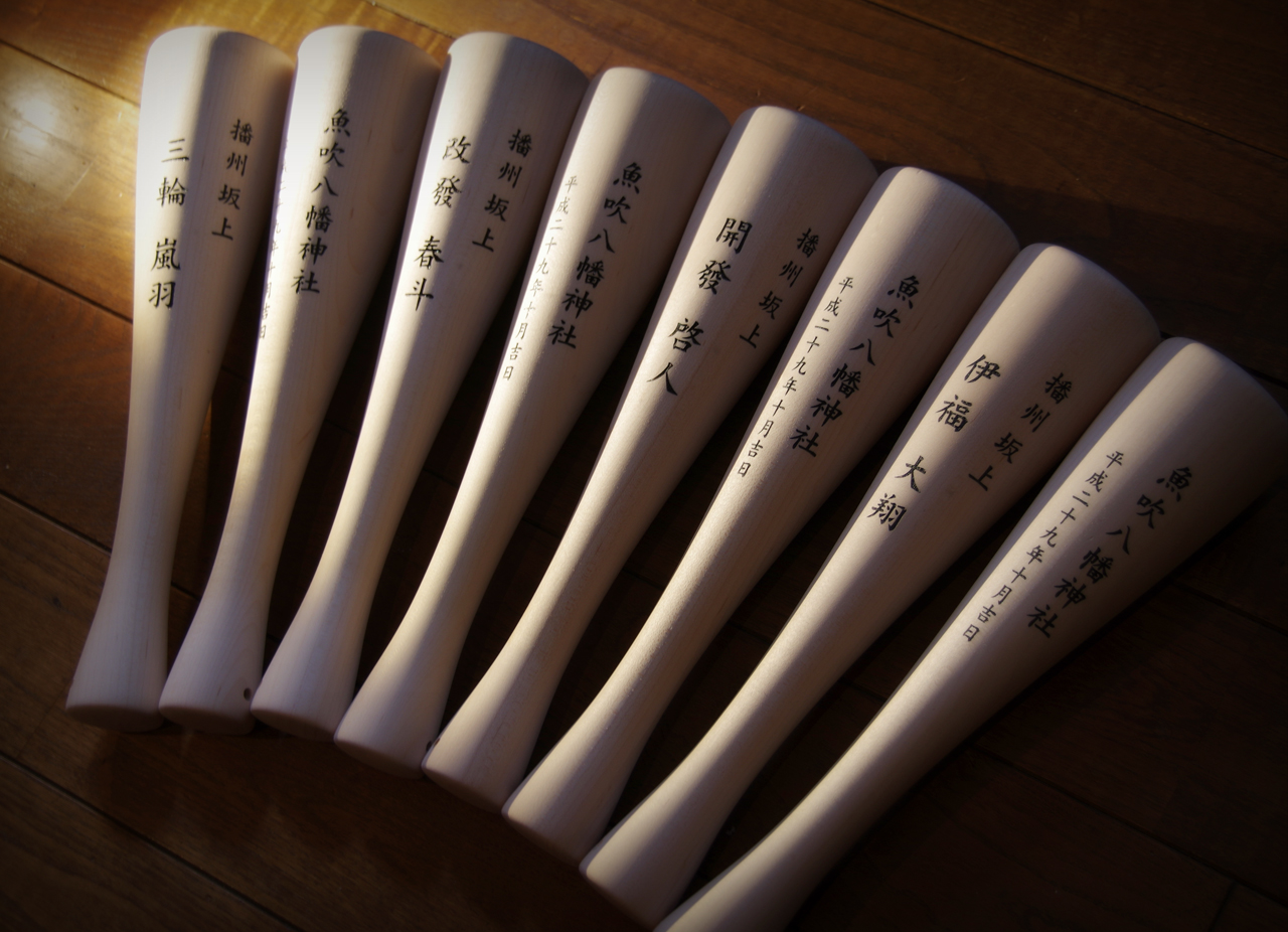 今年も魚吹八幡神社の秋季例祭で使う撥(ばち)に彫刻しました