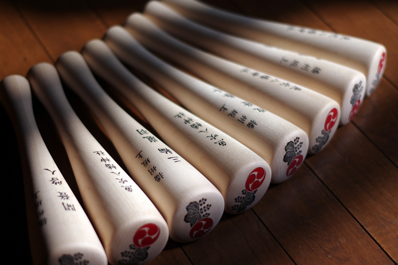 磨き上げられたメイプルのバチに繊細な家紋と名前を彫刻