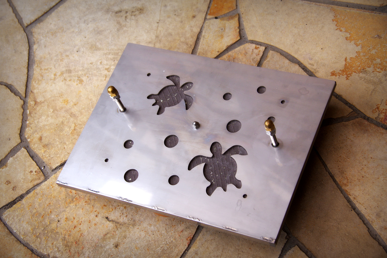 メイン看板の裏面・・・固定用M8ビス溶接、軽量化のためにホヌを切り抜いて