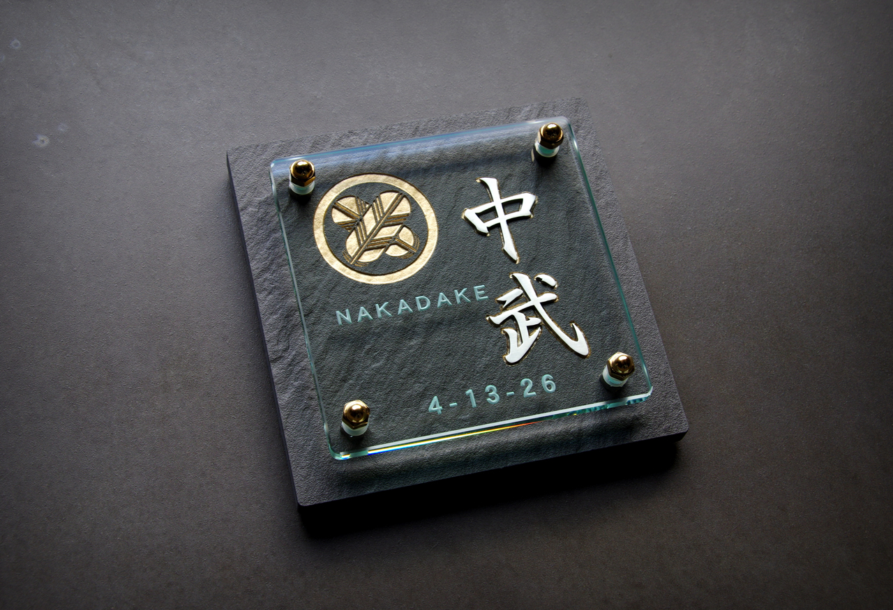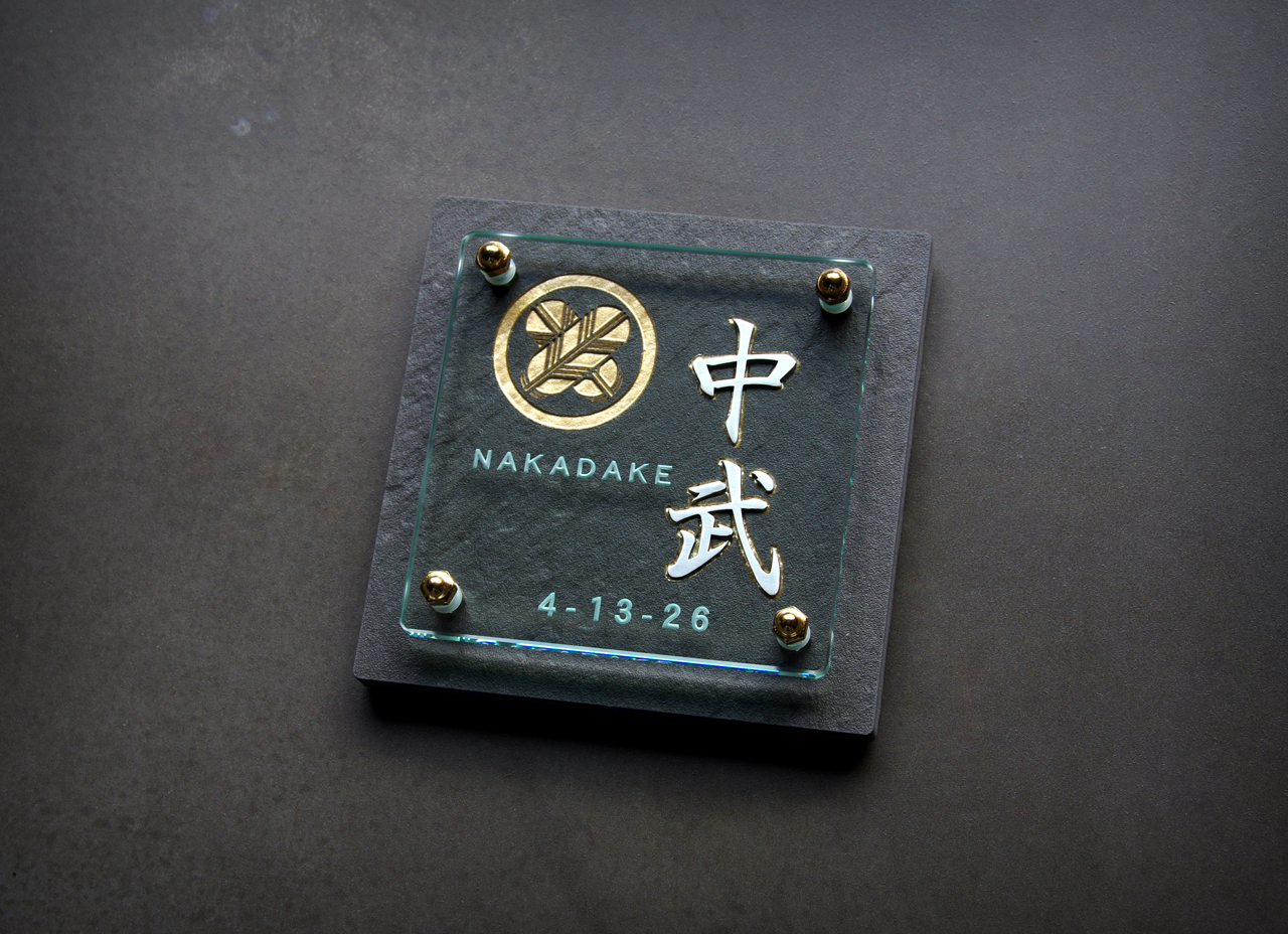 ブログでの作品に一目惚れしすぐに依頼しました。和風モダンでシックなカッコいい表札が出来上がったと思います。希望していた家紋はとても生かされています。ステンレス切り文字はこちらが提示した書式を正確に再現してもらえました。