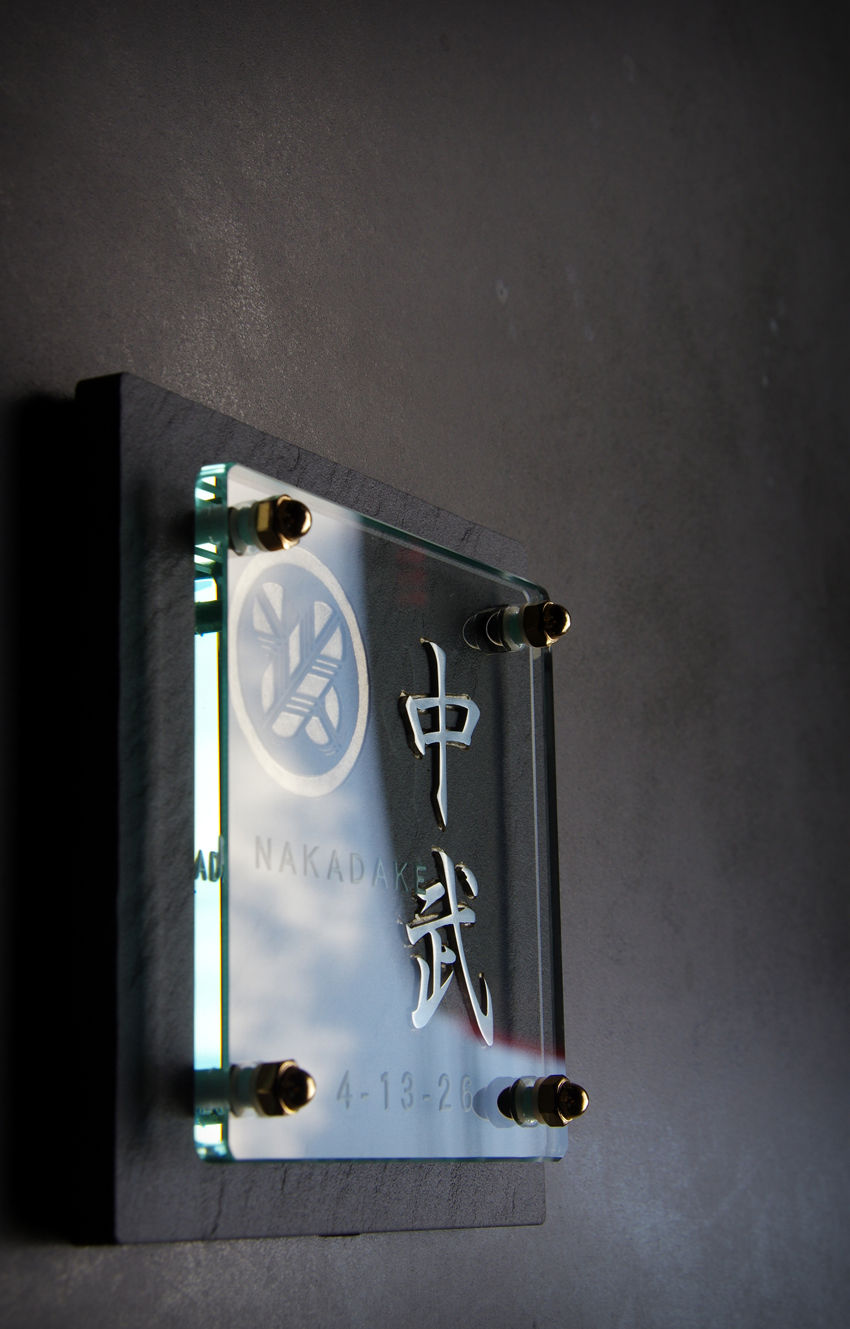 ガラスには英字と番地の立体彫刻、すべてにこだわった表札です