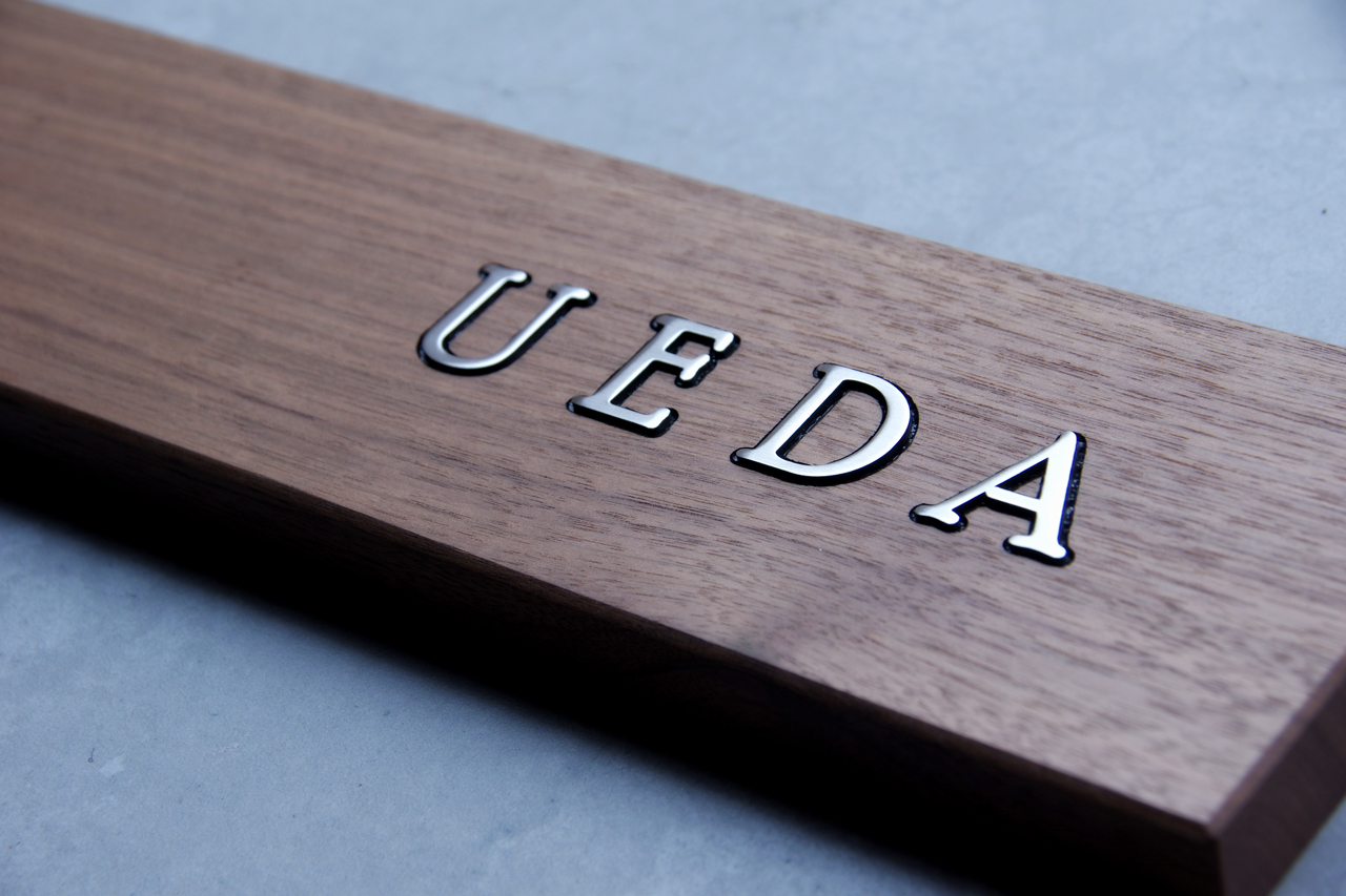 ウォールナットに埋め込んだステンレス切り文字は研磨仕上げの後エッジを丸く加工しています