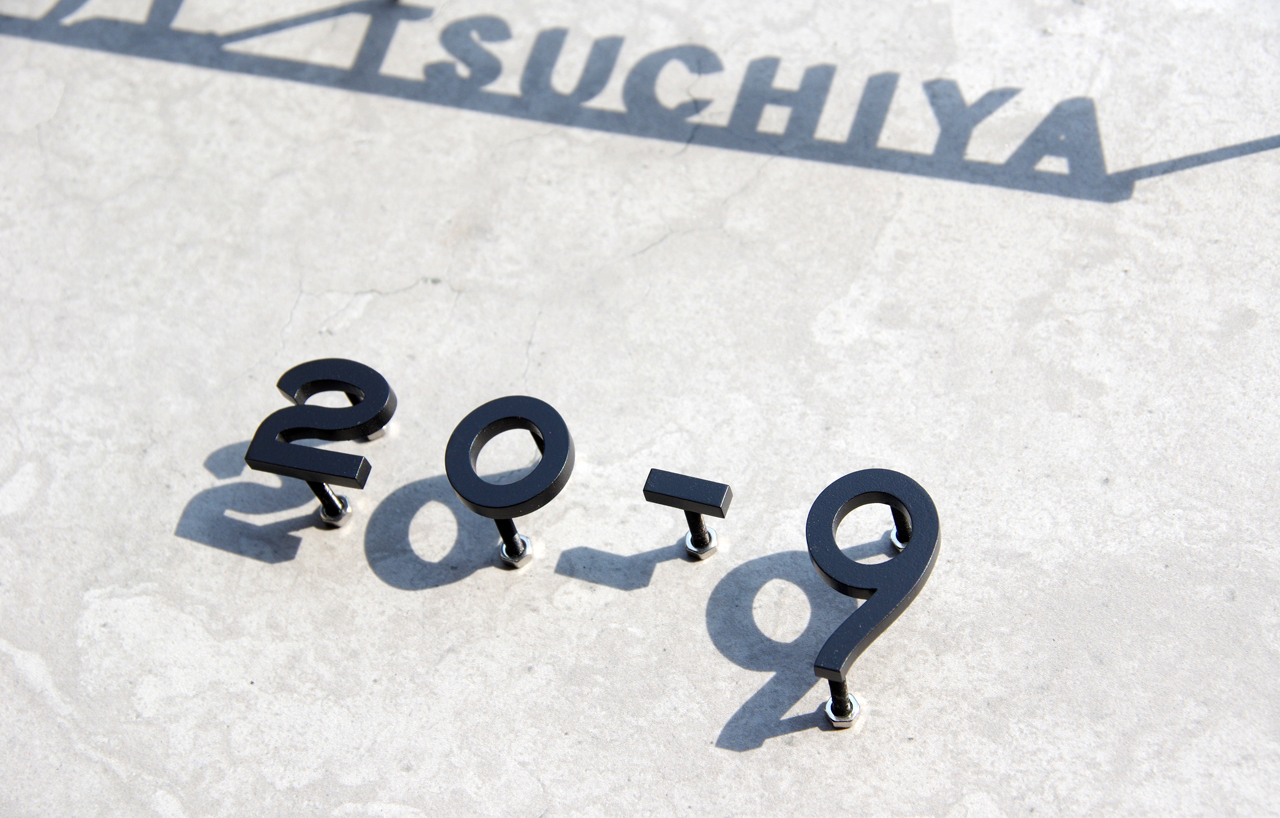 番地は独立文字で製作、表札は少し浮かせて、番地は浮かさずに固定します。