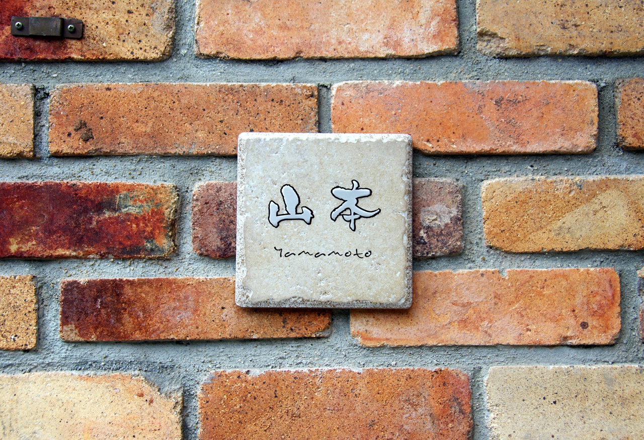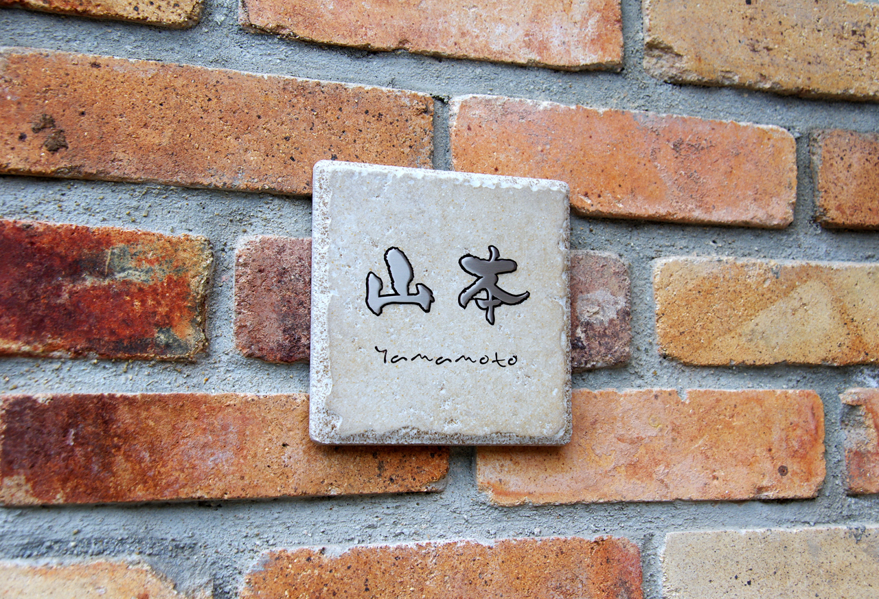 ホワイトのアンティークタイルにステンレス切り文字の表札