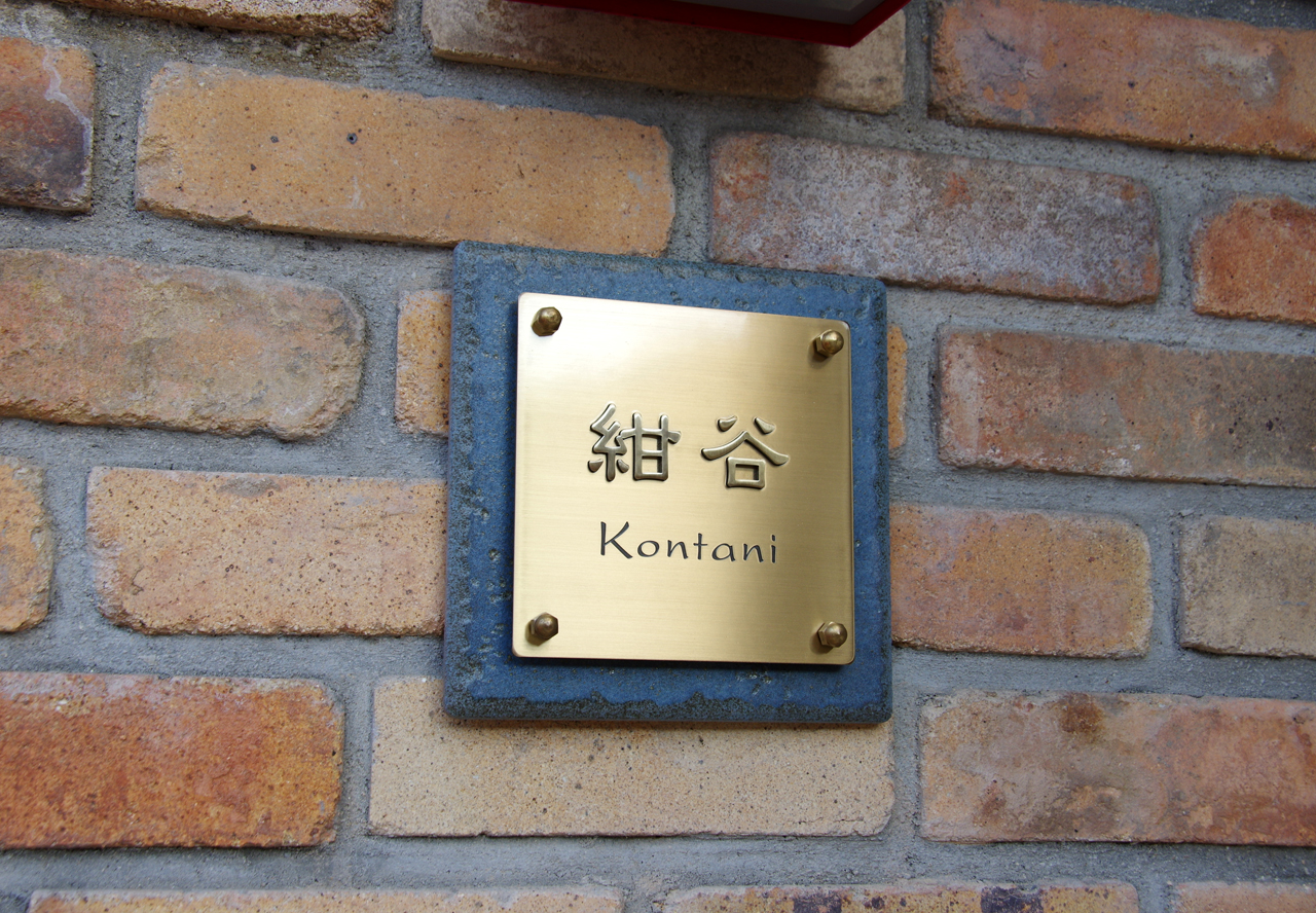 紺色のアンティークタイルをベースに真鍮プレートを重ねたフリースタイル表札