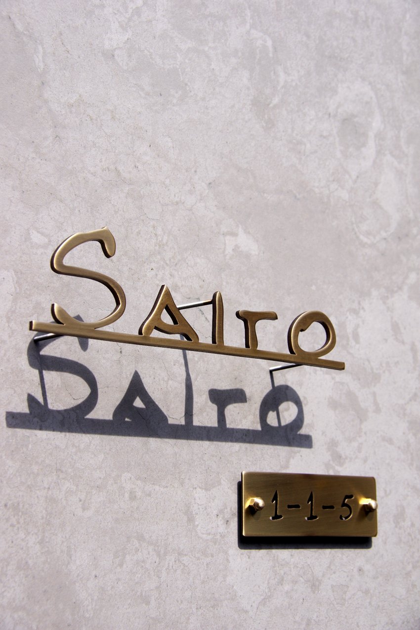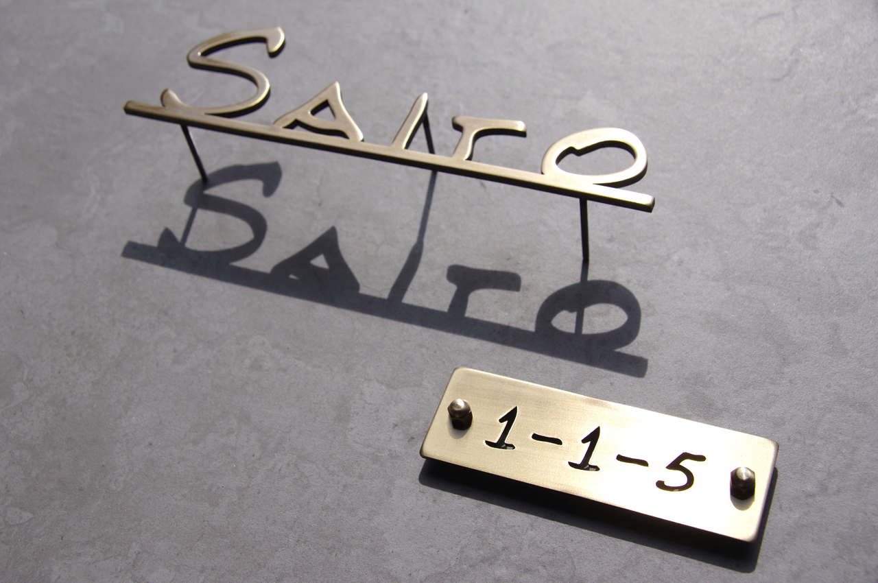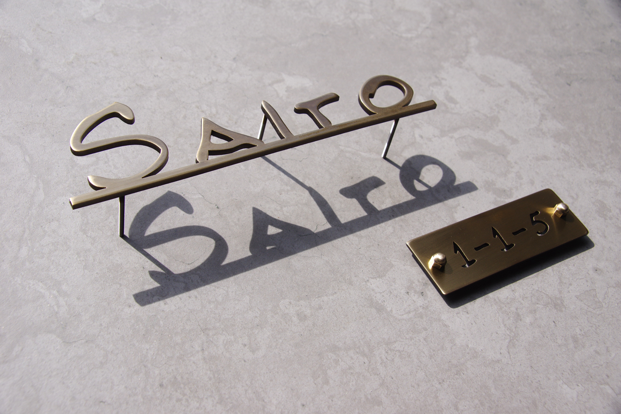 いぶし仕上げの真鍮切り文字表札と番地プレート