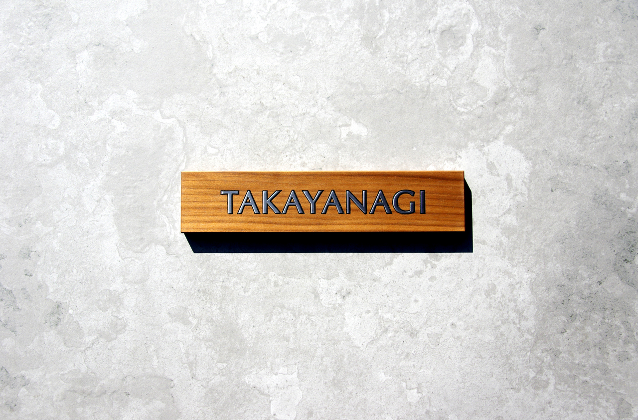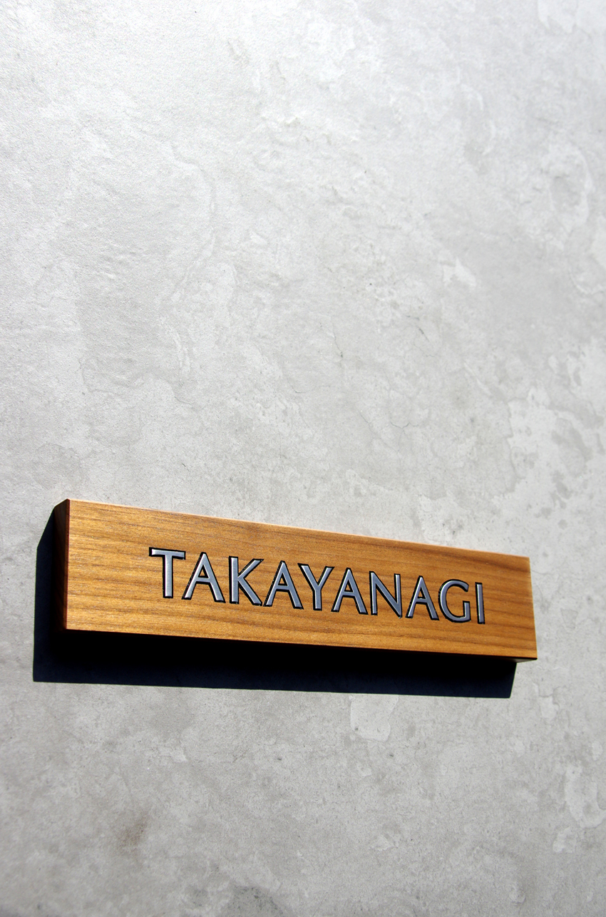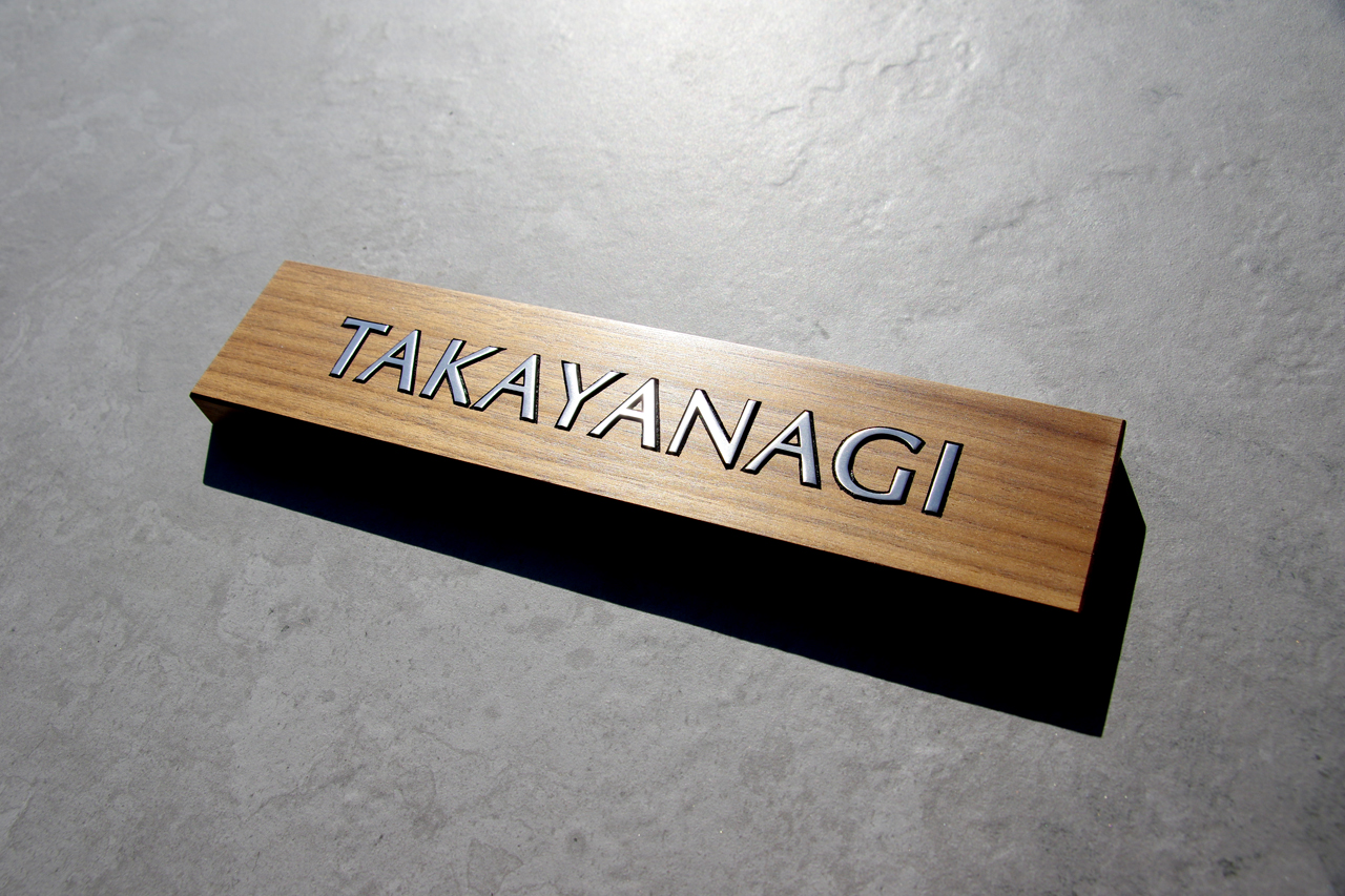 無垢のウォールナットにステンレス象嵌加工の表札