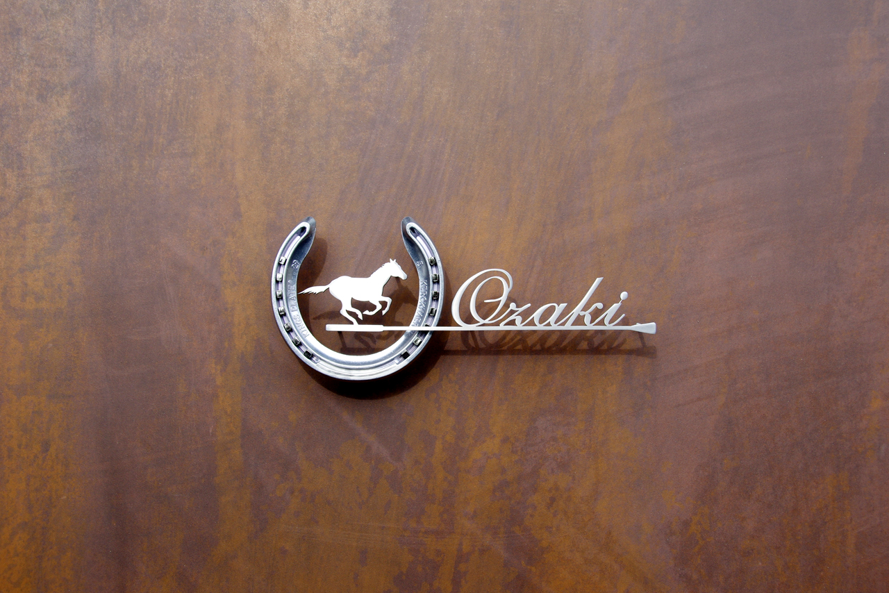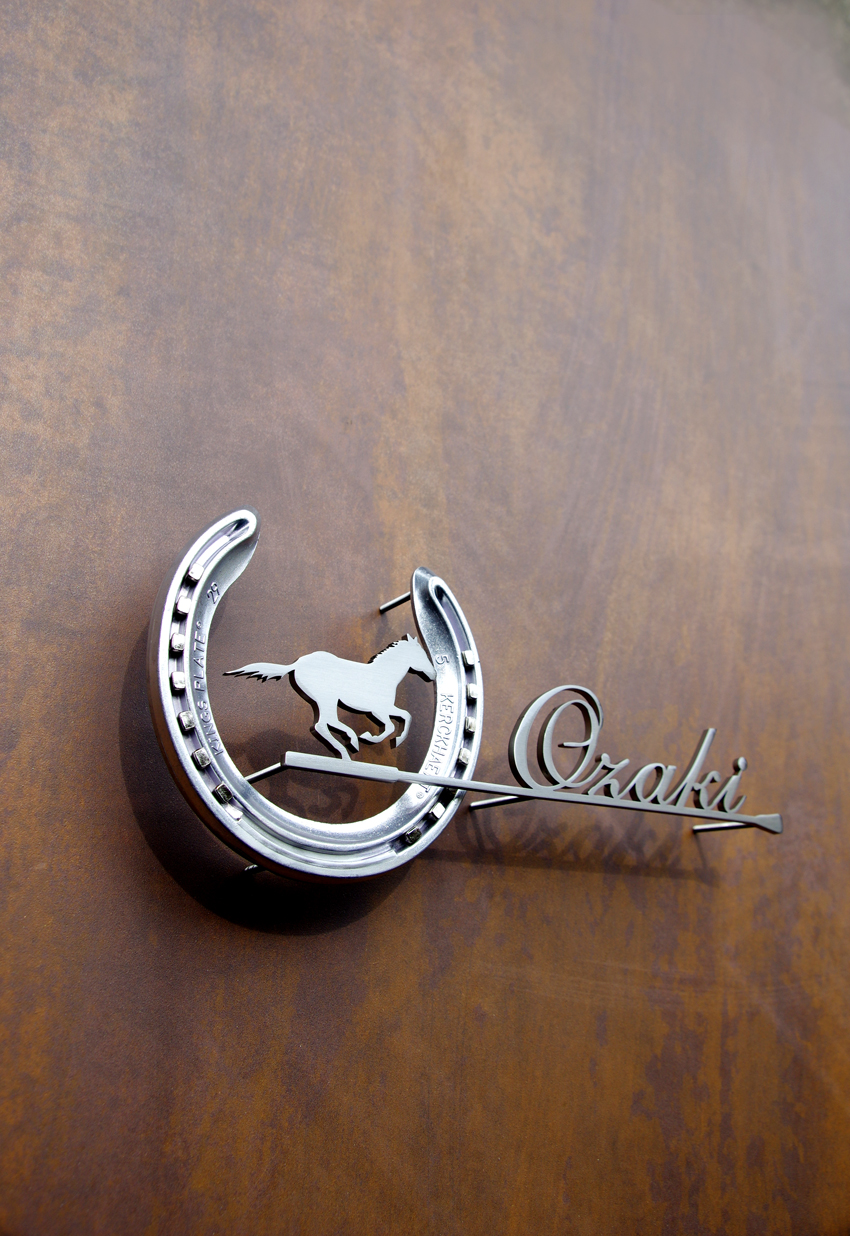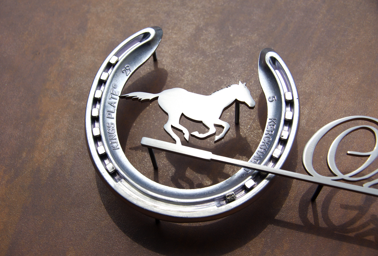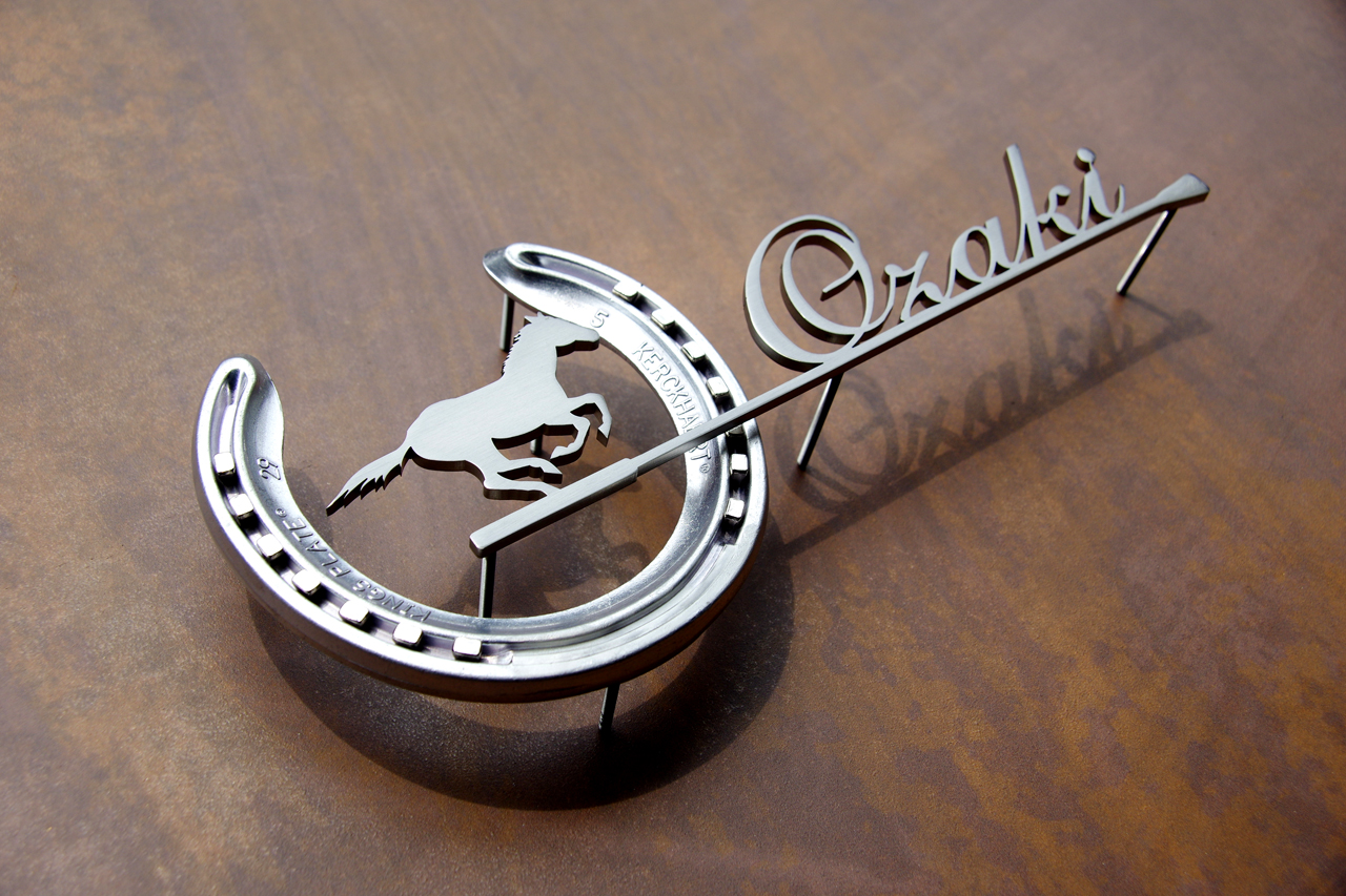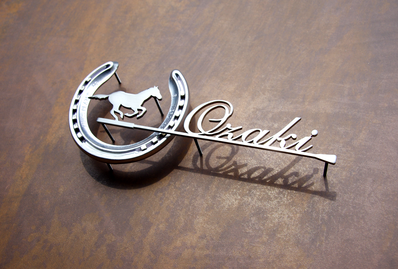 研磨仕上げのステンレスの切り文字、調教用アルミ製の蹄鉄はウレタンのクリア塗装