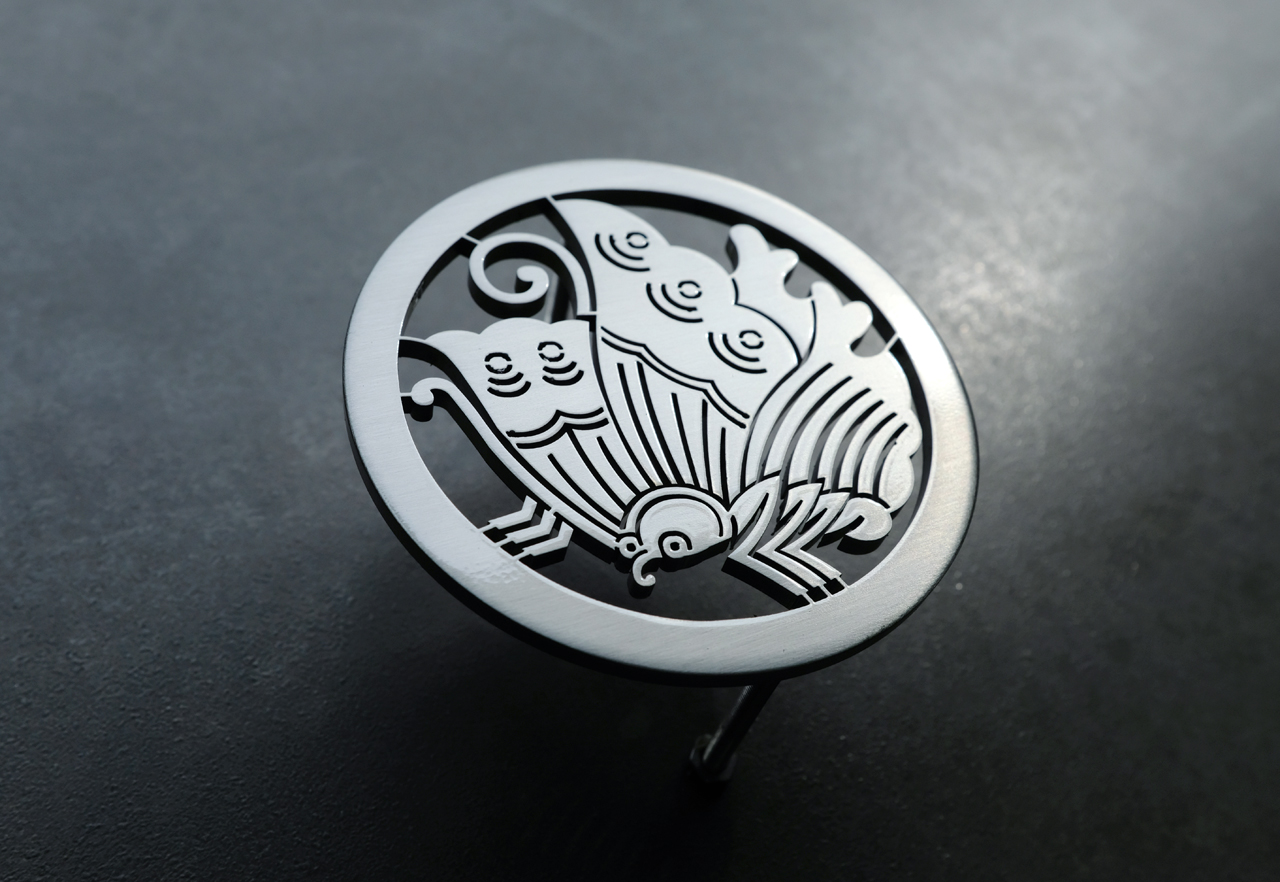 家紋は『丸に揚羽蝶』 厚みのあるステンレスに繊細なデザインを精密加工で表現